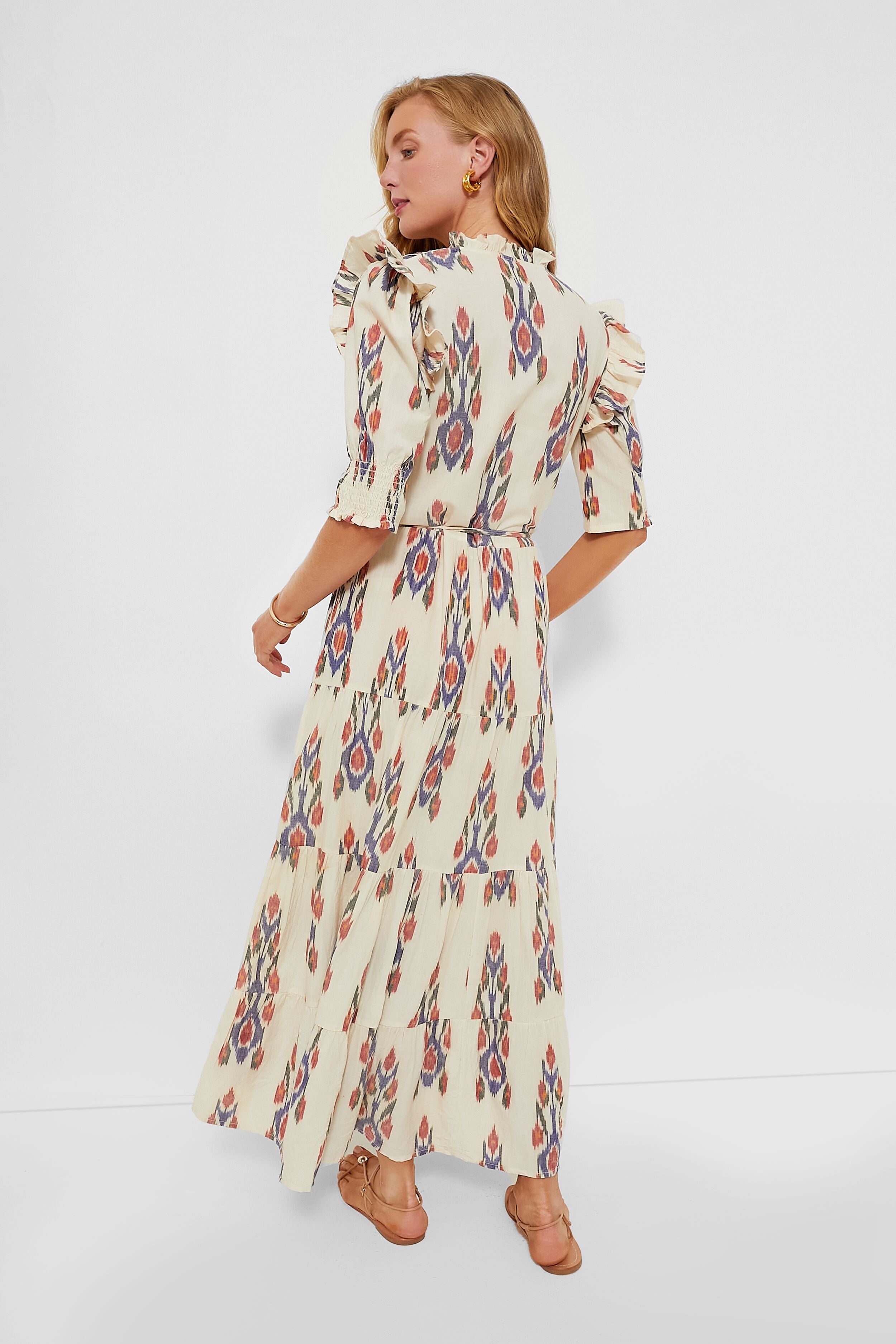 The Sanford Cream Cinched Pintuck Maxi Dress is a chic style with feminine details and an eye-catching print. This maxi features ruffle shoulders. half-length puff sleeves. and a tiered body. Pair with sandals and a tote for days spent wandering around town. or dress up with statement earrings and heels.