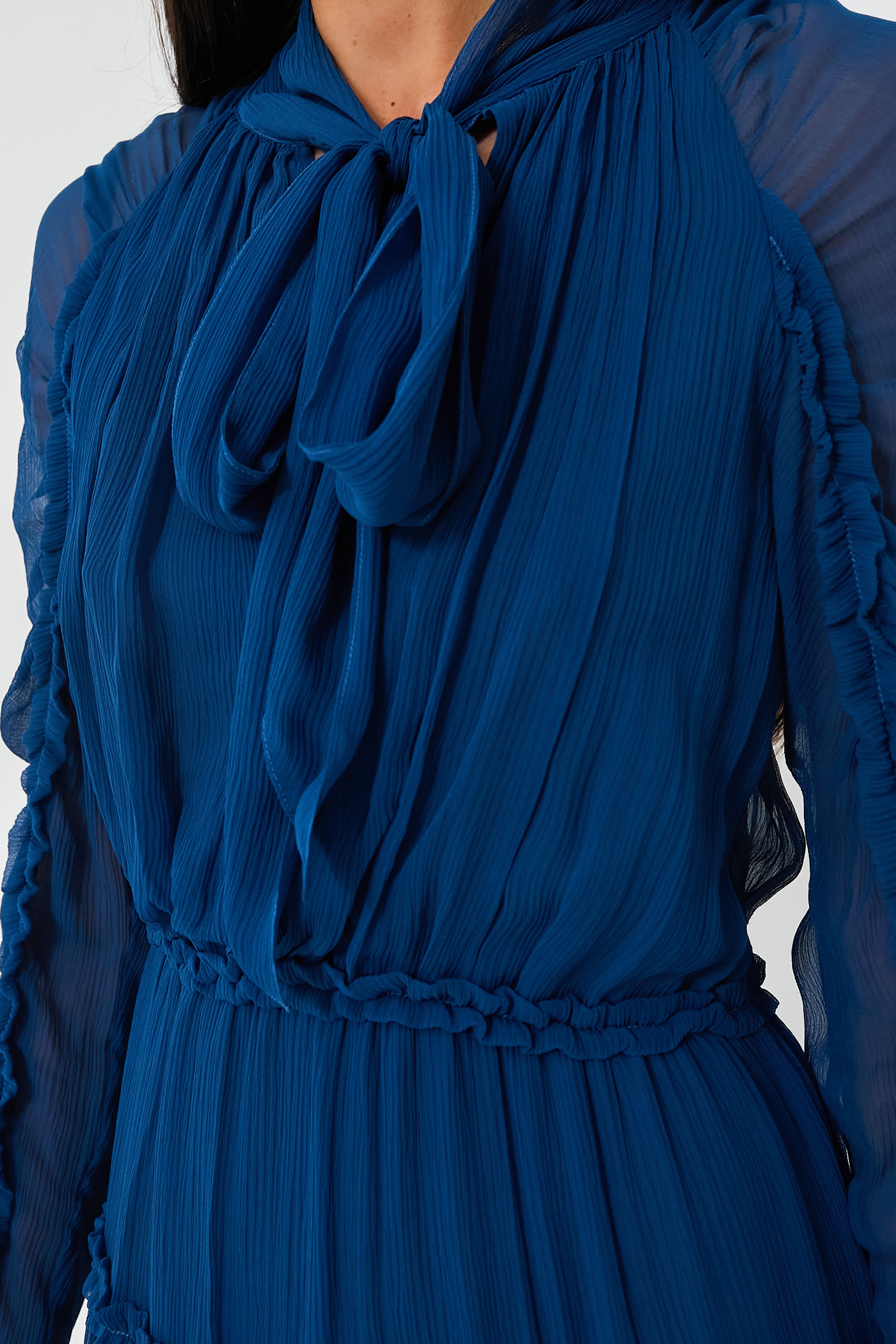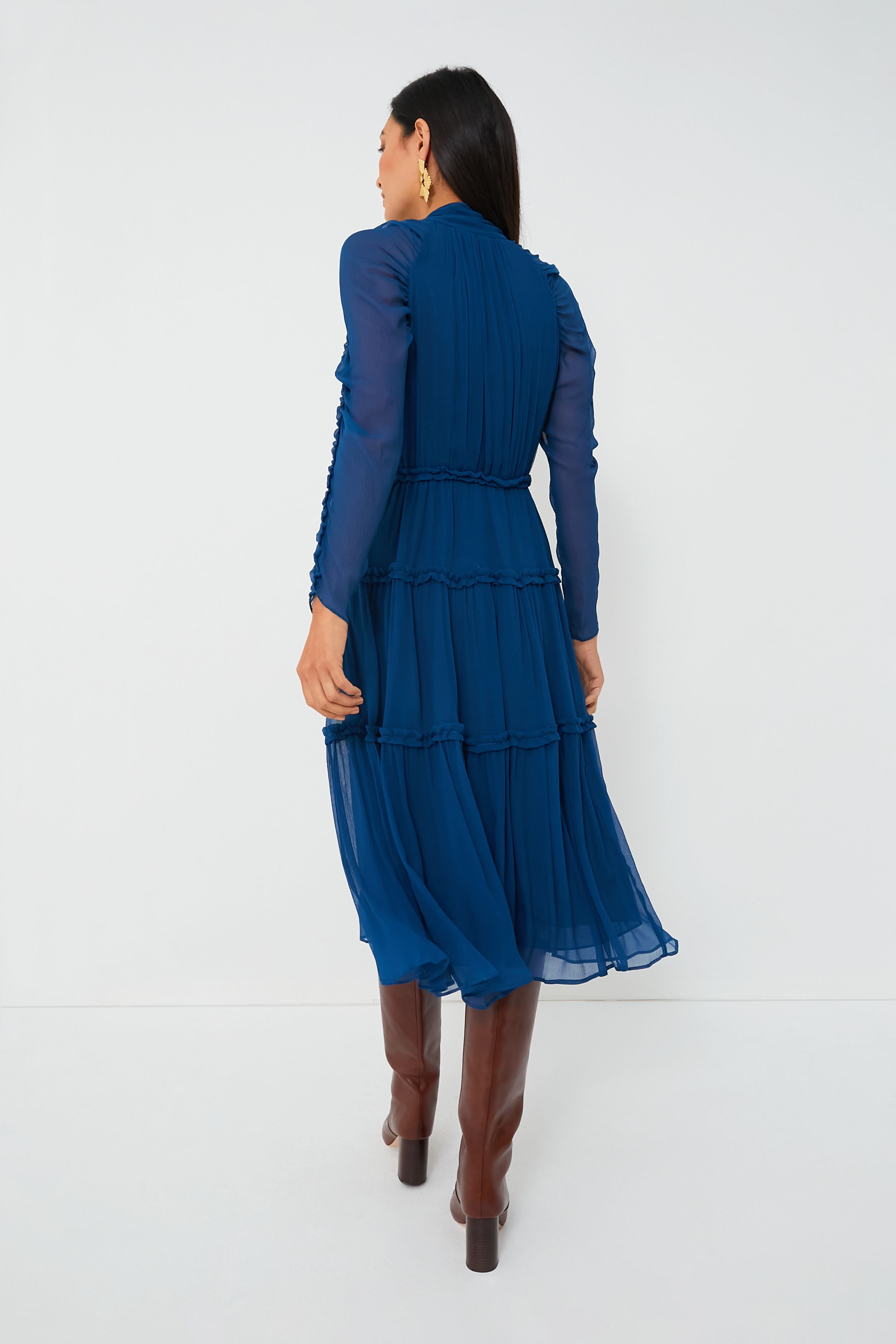 A stunning. jewel-toned beauty. the Sapphire Idalia Dress is exactly what we have been searching for. An elegant midi dress with plenty of feminine touches like the self-tie bow at the neckline. ruched sleeves. and ruffle trim at the skirt tiers. this sophisticated silhouette is earning a place in our closet this season. Dress it down with boots and a top handle bag for lunch dates and after-work drinks. or elevate it with ease by adding heels and statement earrings for evening occasions.