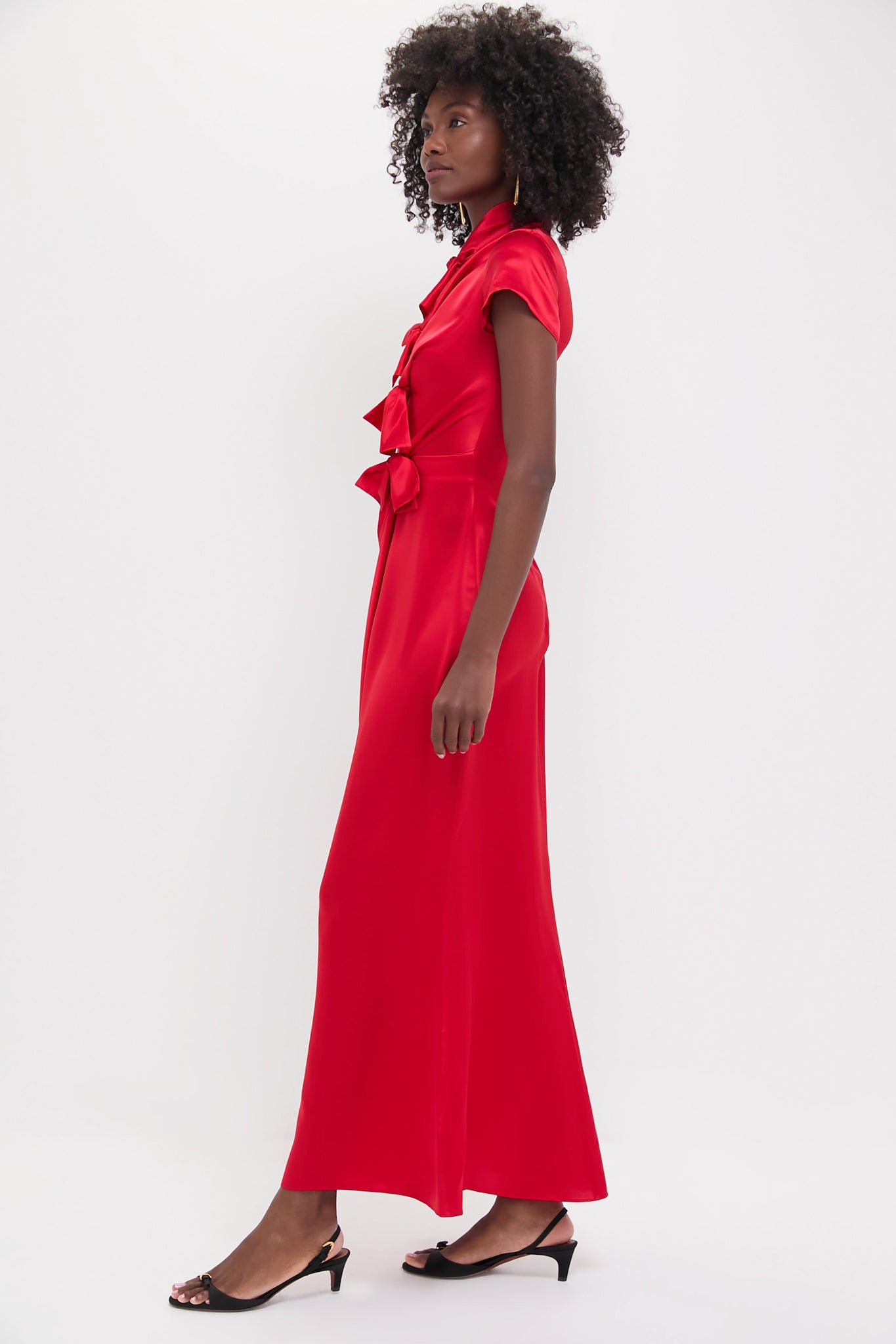 The Scarlet Kelly Dress is draped in soft silk with gathered bows and a high neckline. With high neck ties for elegant drapes. cap sleeves. and a wrap skirt. the Kelly Dress exudes feminine charm for any occasion. We styled it with gold jewelry. a gold clutch. and black heels!