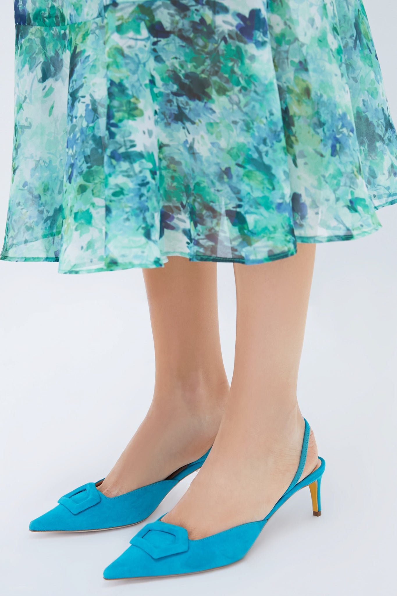 The Scuba Amnita Heels are the ultimate statement shoe- with a sleek pointed toe. elastic achilles strap. and eye-catching blue suede upper. these are the perfect way to add a pop of color to any outfit. We are styling them with wide leg denim and a white button down. or bringing out the blues in a playful floral maxi.