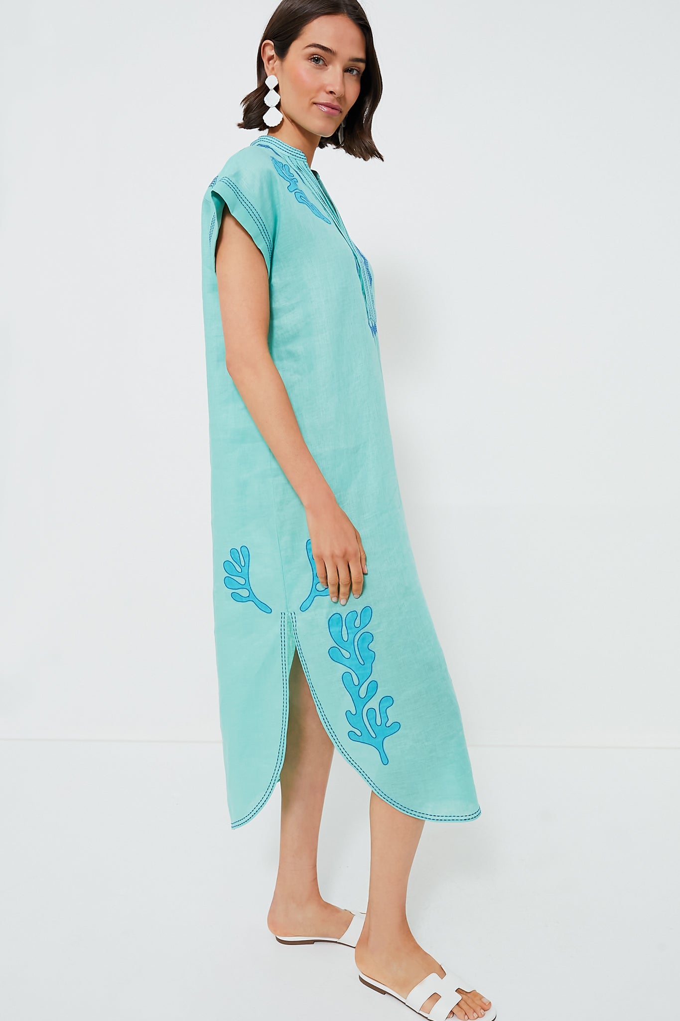 Cut in a loose-fit shirt dress style with a matching tie waist. the Aree Kaftan in vivid Seafoam is perfect for warm-weather weekends. The striking midi style has an ornate hand-embroidered neck detail of linen flowers and intricate thread borders around the hem and sleeves. Pair with sandals and a tote for a beach day. and switch into espadrilles and statement earrings for dinner!