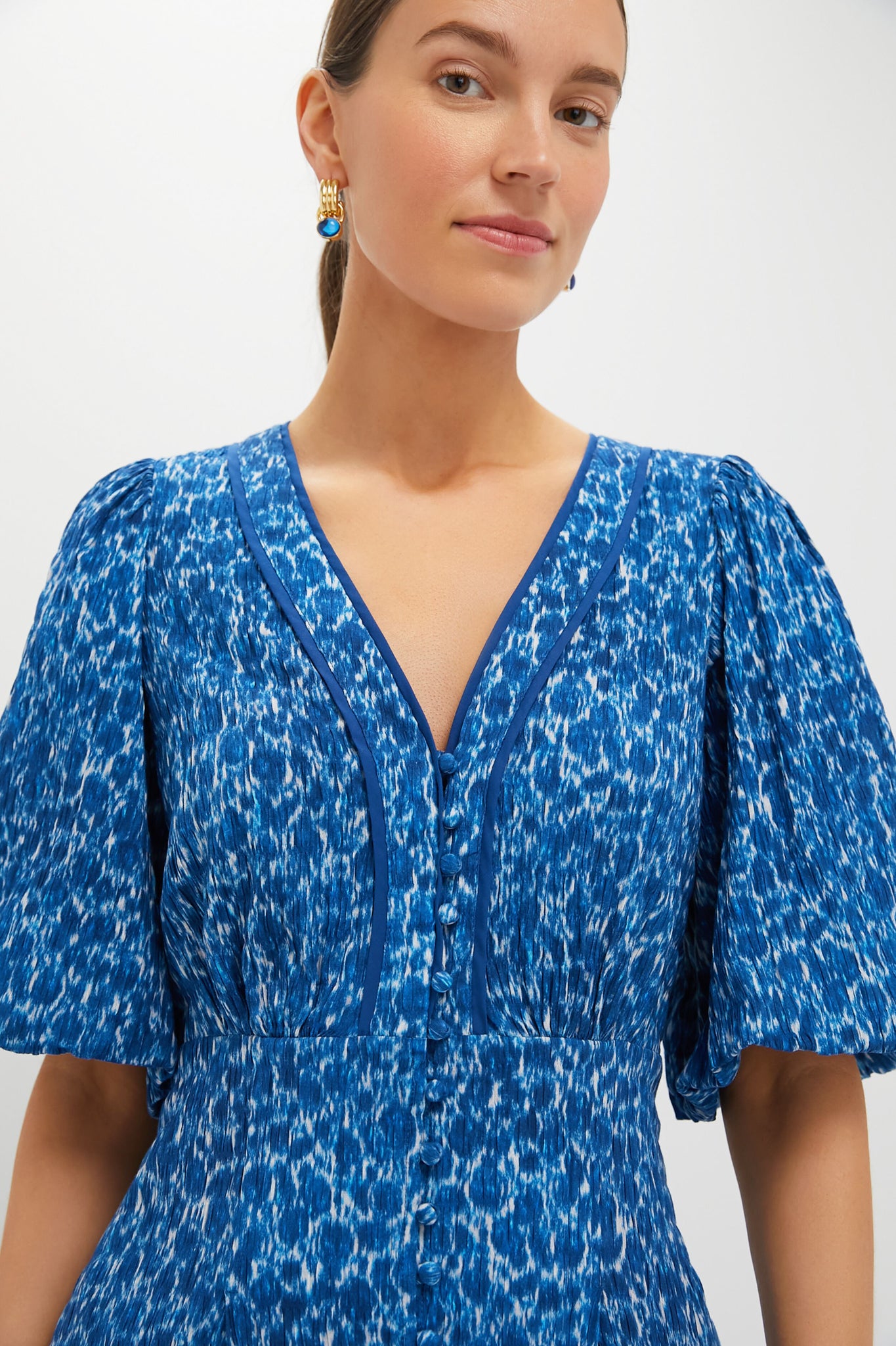 The Seaport Blue Dana Dress features a midi dress in a gorgeous blue hue. With a flattering fitted bodice. V-neckline. balloon sleeves. and side seam pockets. this dress is not only ultra flattering. but functional. Pair with heels or flats. a clutch. and a coordinating blue earring with the perfect versatile dress for the office. afternoon drinks with the girls. or celebratory occasions alike!