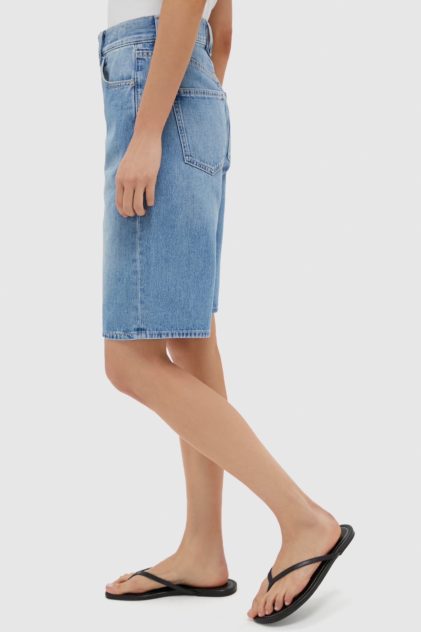 The Charlotte is cut from premium non-stretch denim in a classic light blue wash. designed for a snug. high-rise fit on the waist and hips—and loose throughout the thigh. Hitting just above the knee. this versatile style exudes laid-back cool. Pair it with a crisp. classic tee or an airy button-down for timeless style.