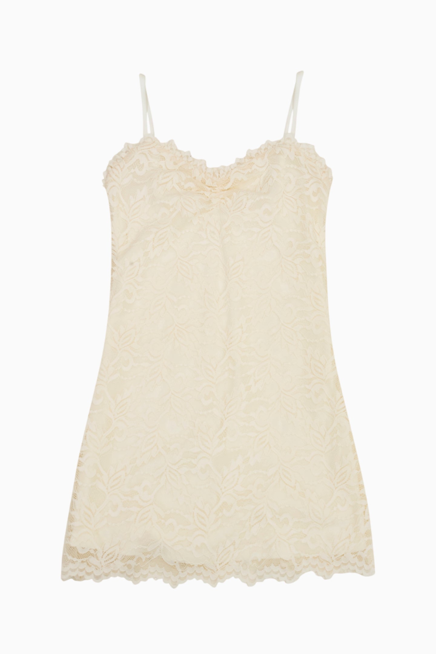 So sweet in the Siofra Dress. This pretty piece stuns with a lace-adorned fabric with scallop details. thin spaghetti straps. and a frayed neckline. The dress comes fully lined.