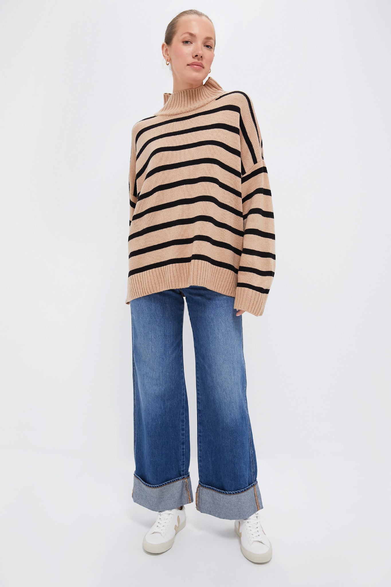 Spun from plush sweater yarns. the Oversized Sweater has a relaxed shape featuring dropped shoulders. a funnel-neck and ribbed trims. In a gorgeous neutral stripes that will take your through the fall season from pumpkin patches to nights around the fire with family. we recommend pairing with denim. ballet flats. and a hobo bag!