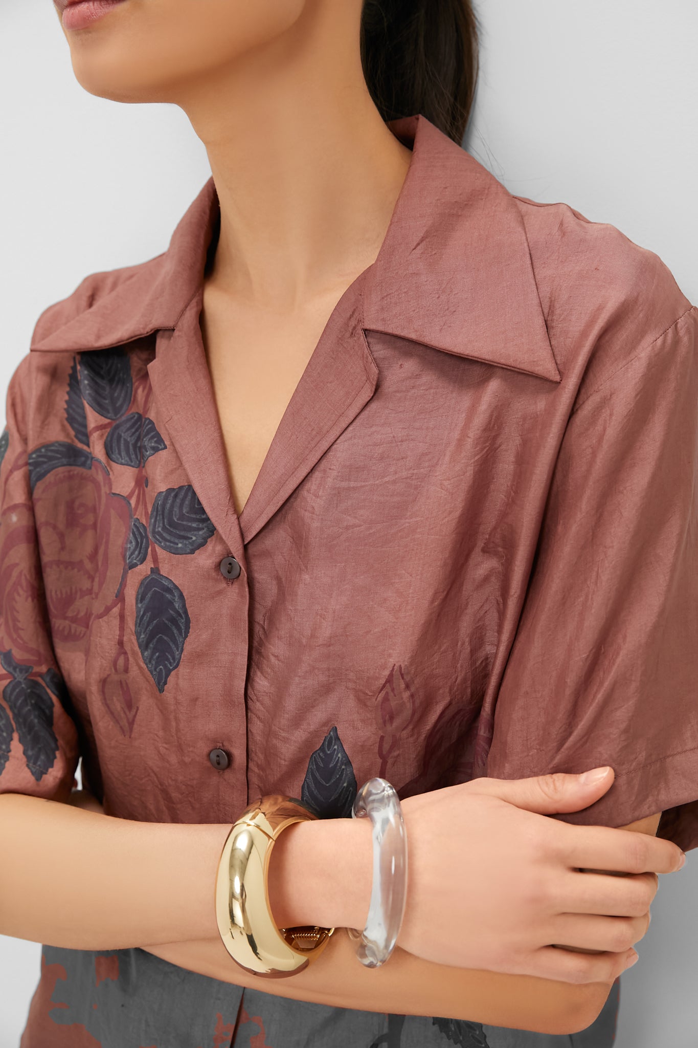 Rendered in hand-loomed silk. the Stevie Mauvewood Rose Shirt features an open collar. mother-of-pearl button front. and a relaxed silhouette. Inspired by a vintage Hawaiian shirt. the slightly cropped shirt is hand-block printed with an asymmetric rose motif. Pair with the matching Otto Mauvewood Rose Pant. sandals. and a tote for cool. leisurely style.