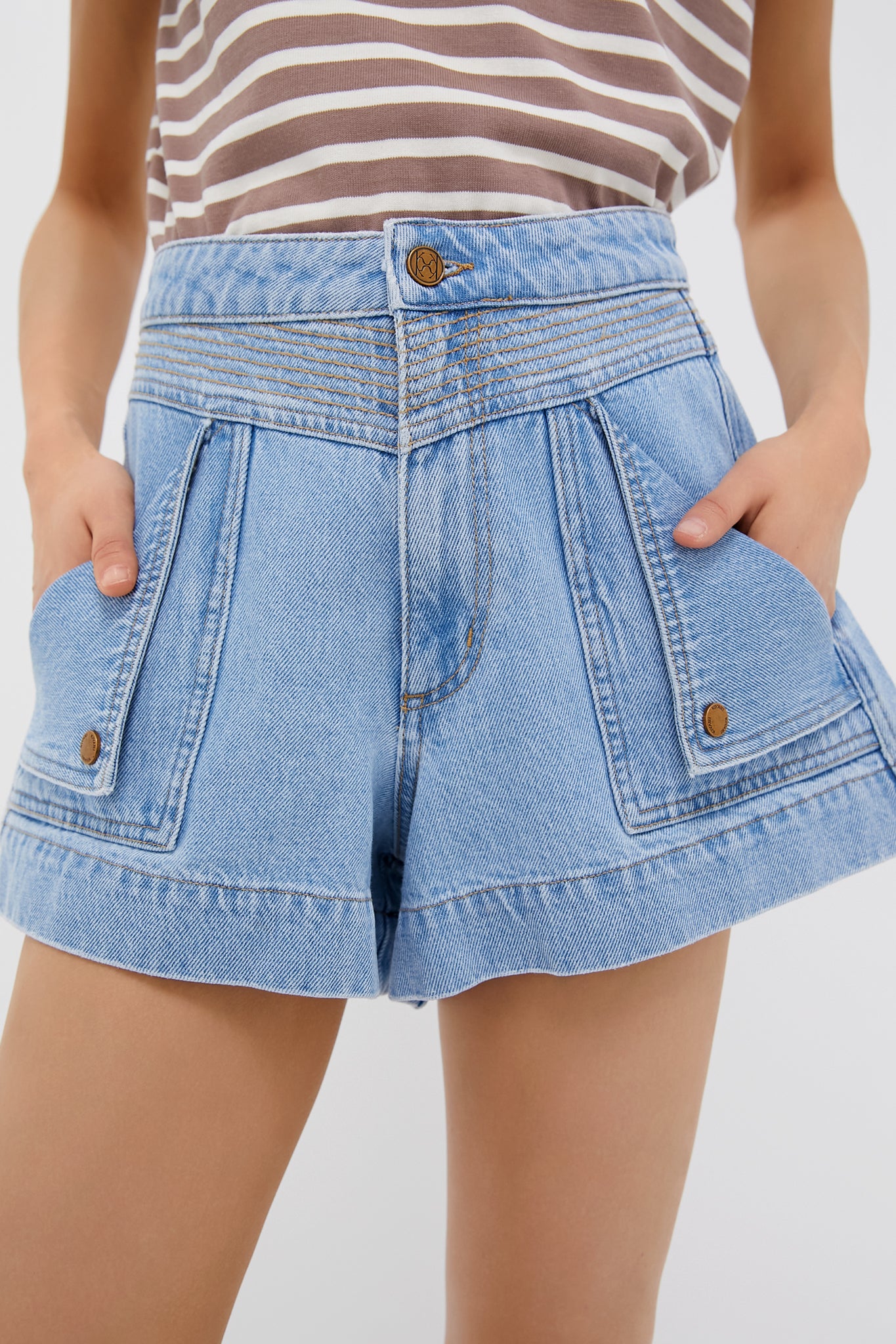 The Celene Denim Short in a light blue stonewash features contrast topstitching and panel detailing. front fold over pockets. complete with antique brass logo hardware. These fashion forward shorts are sure to be a staple in your warm weather wardrobe. Pair with tees or tanks. and sandals or sneakers for a casual weekend look!