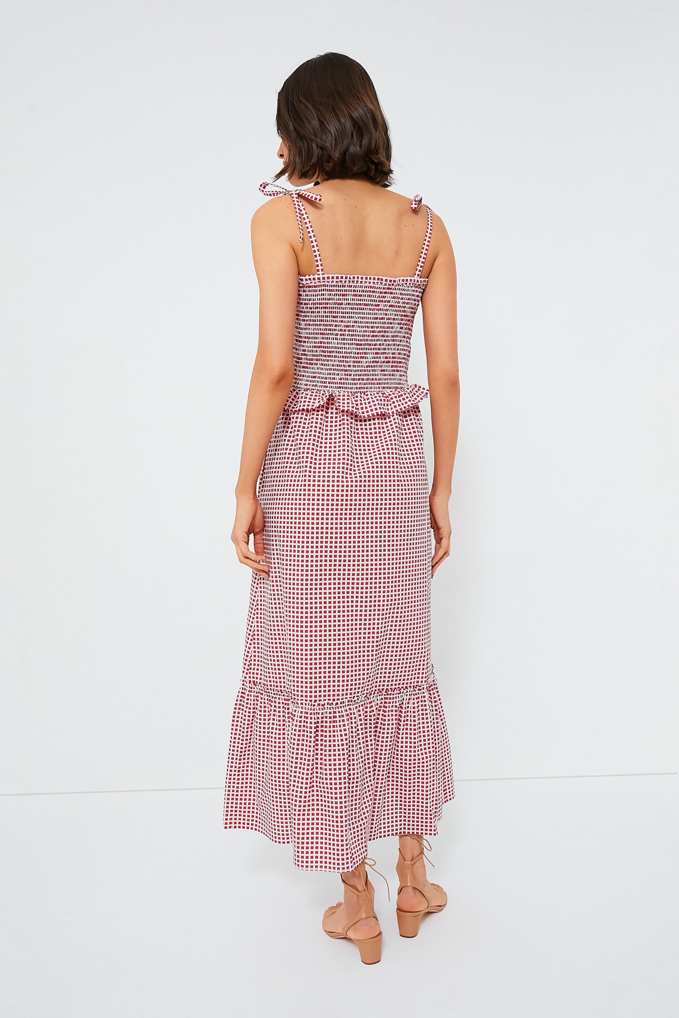 If you love the natural. bohemian look but want something more polished and elevated. the Strawberry Check Alberica Dress is the way to go. This beautiful front-buttoned maxi features smocked bodice. ribbon straps. ruffle trim at waist. at tired skirt. Versatile enough to dress up for a dinner date with gold jewelry or down for a walk in the park with sandals. this is going to be your new go-to style!