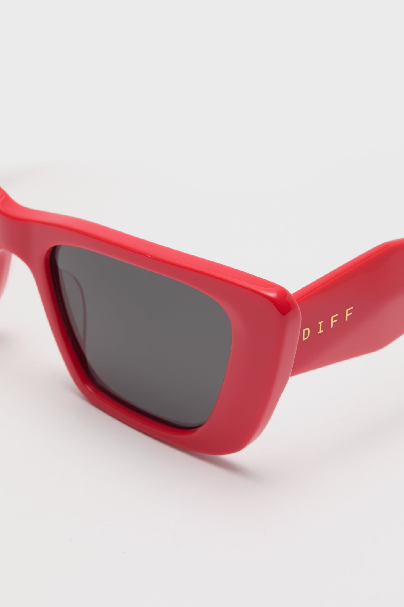 With a fabulously bold shape and color. the Sunset and Grey Aura Sunglasses offers an angular square silhouette creating a cool and fashionable vibe. Pair with a sundress or a caftan on warm days. or pair with denim and outerwear when the temps drop but your eyes still need protection.