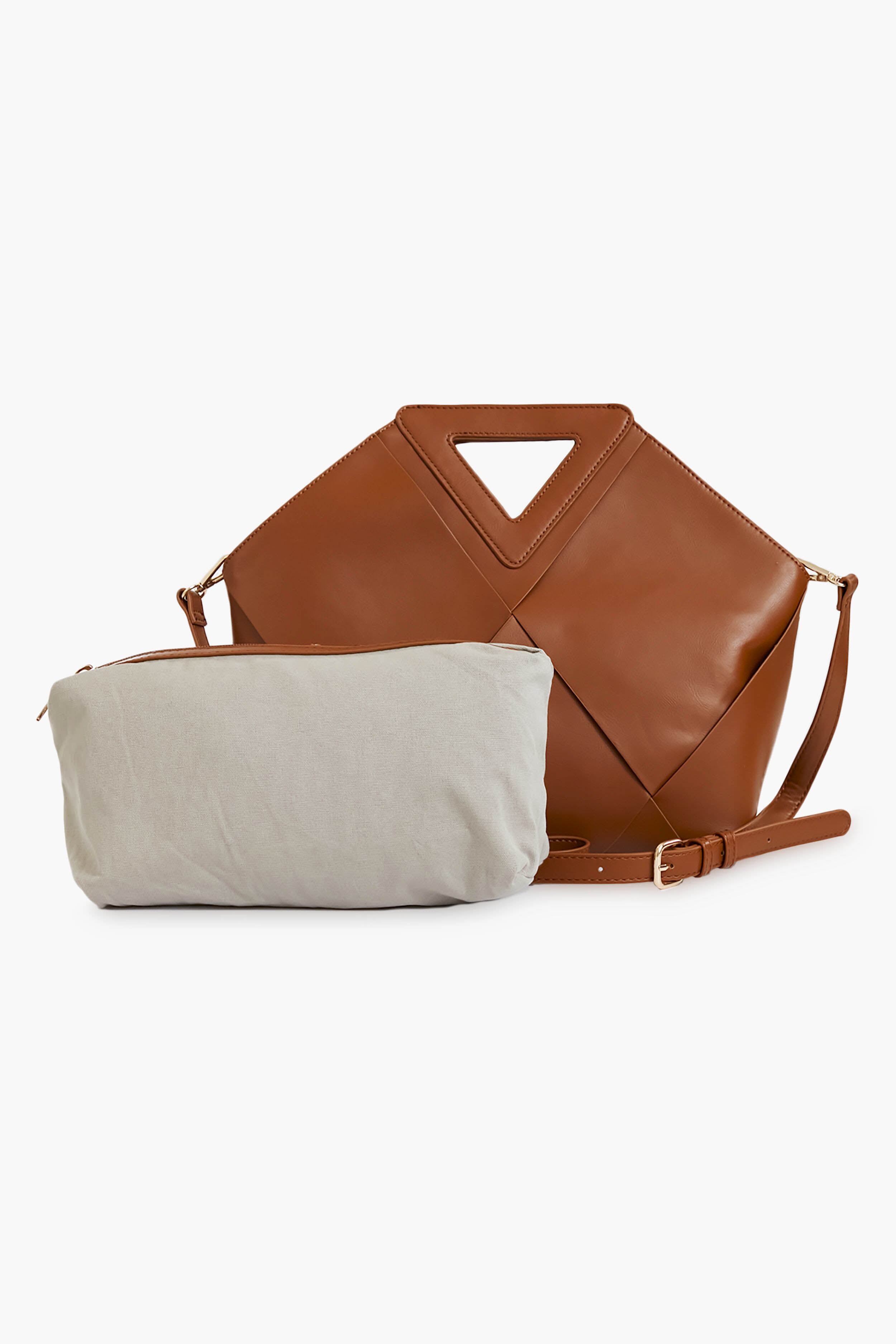 The Tan Athena Bag takes the traditional satchel silhouette and turns it on its head. With a large weave patterned exterior that adds a hint of uniqueness. as well as an ethical vegan leather composition. this tote is as beautiful as it is conscious. Toss all of your essentials inside this lovely style and utilize the interior zippered pouch to keep everything secure.