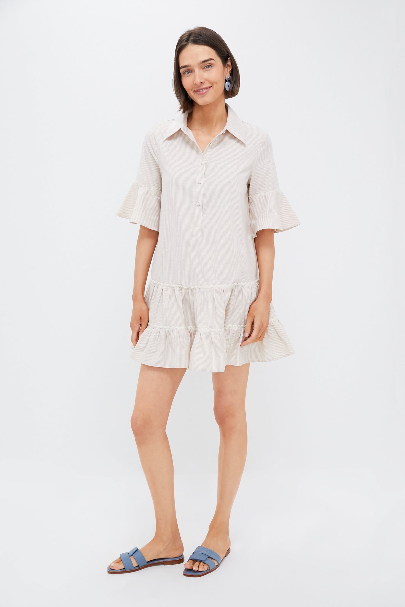 The Mckenna Dress is everything we want in a mini and more- a classic striped shirt dress silhouette with feminine details such as the flared cuffs. delicate lace trim. and tiered ruffle hem. An easy throw-and-go style that can be dressed up or down. we are styling this number with everything from ballet flats to sneakers.