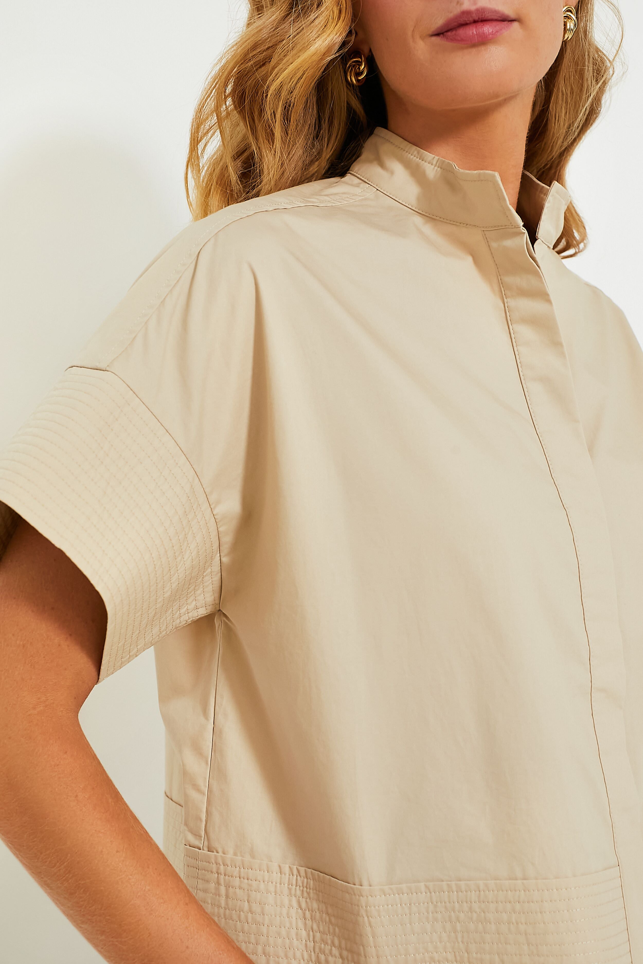 The Tan Sofia Shirt is the elevated style staple your closet needs. A short sleeve button down with a slightly cropped hem and a boxy silhouette that's perfect for pairing with all kinds of bottoms. this style is finished with trapunto stitching that adds an extra-special detail to a classic look. Style with trousers and flats for the office. with a skirt and kitten heels for a dinner date. or with denim and crisp sneakers for weekend wear — this number can do it all.