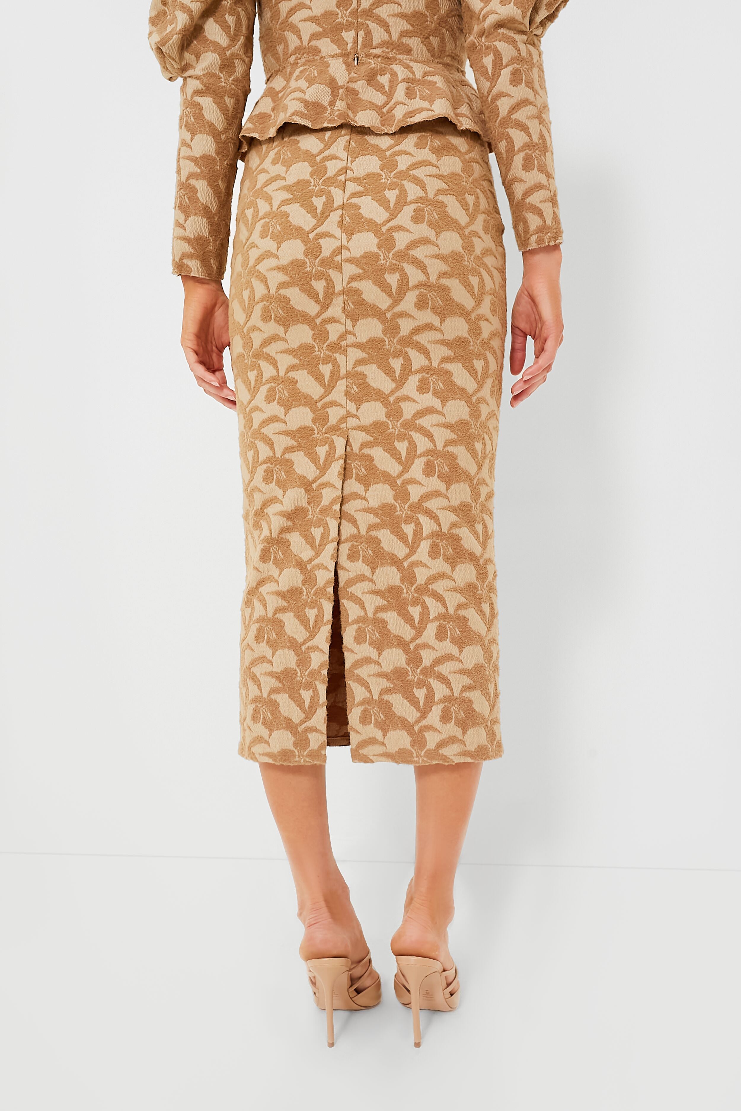 Stand out in style with the Taupe Augustine Skirt. Cut to a slim pencil silhouette that skims the body and hits mid-calf. this midi has a flattering high rise and a back vent for ease of movement. The warm jacquard wool fabric makes it a great go-to for cold-weather parties. and the unique embossed pattern effortlessly exudes elegance. We are pairing this with the Taupe Augustine Top for a chic matching set. or with a silk blouse and gold stilettos for a dinner party look.