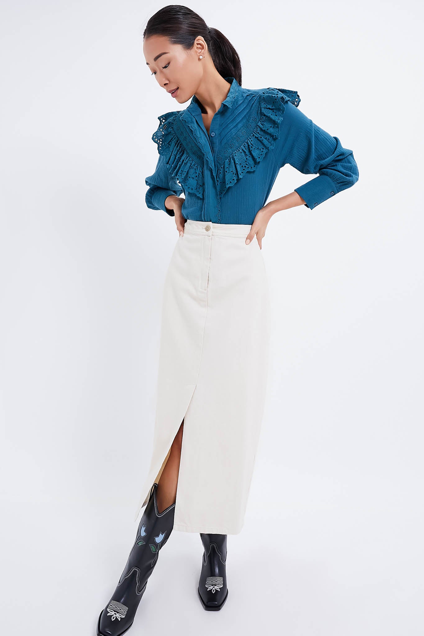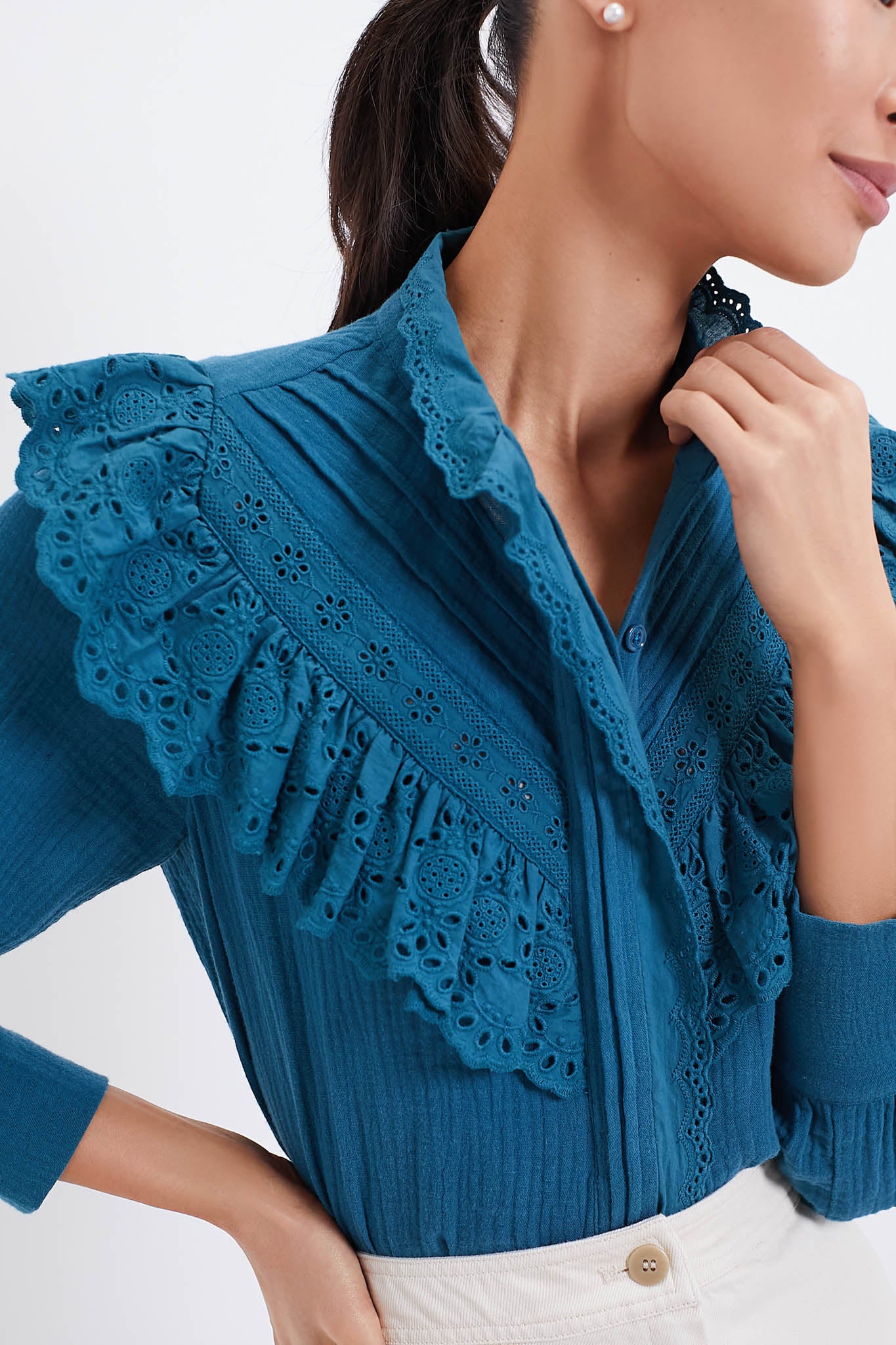 The Teal Eyelet Tatum Blouse boasts long balloon sleeves. a lace trim stand collar. and lace trim and eyelet ruffle detailing along the front yoke. A feminine style for everyday wear. we are styling it with dark wash denim and boots or a maxi skirt and heels!