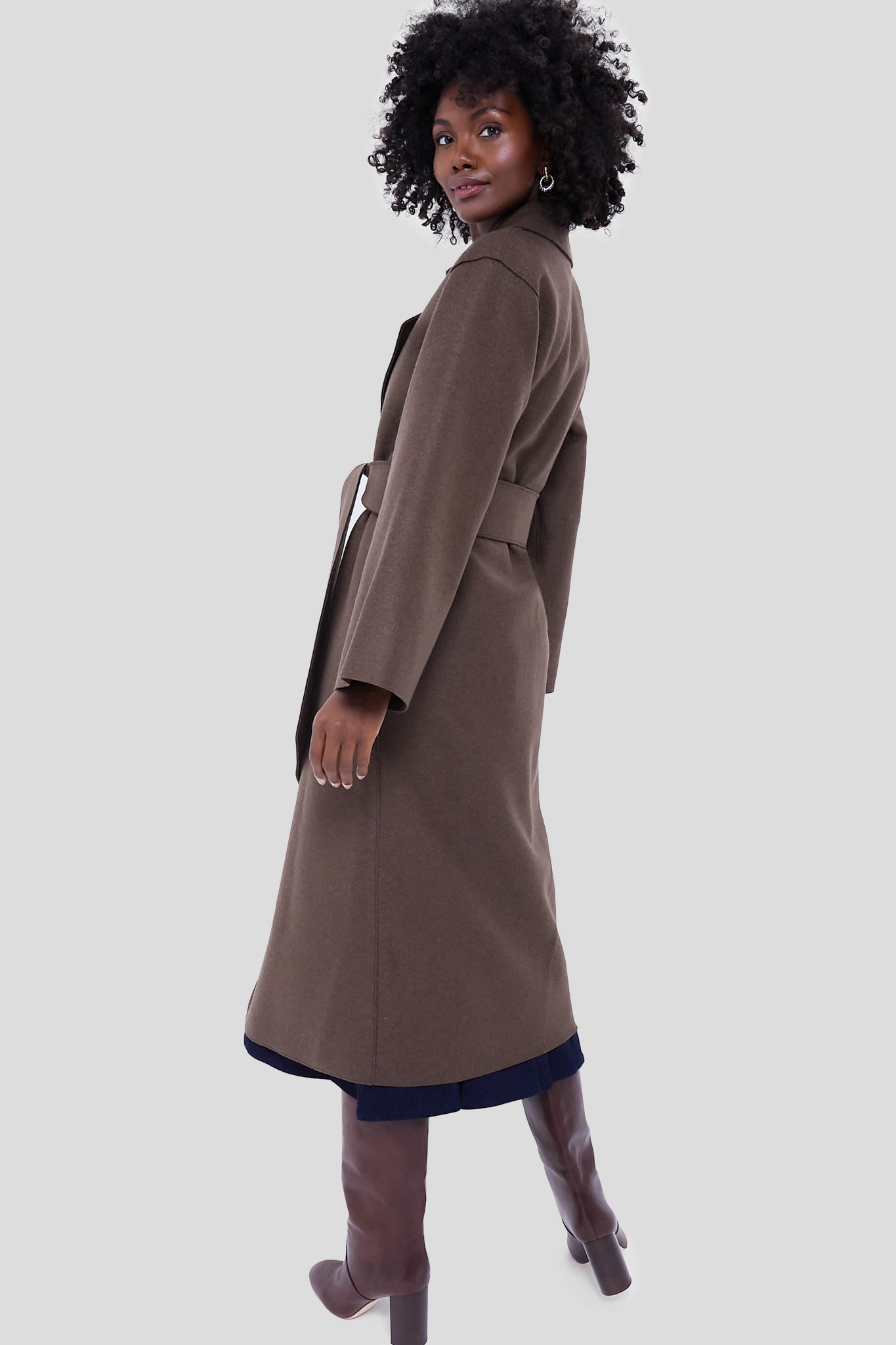 Crafted from a luxurious pure wool fabric. the Teddy Brown Belted Clutch Pressed Wool Coat has us craving cold weather days. This wraparound silhouette boasts a wide lapel collar. long sleeves and side pockets. Finished with an self-tie belt for a look that's equally fashionable as it is functional — style with go-to denim and sleek boots for an effortlessly chic outfit formula.
