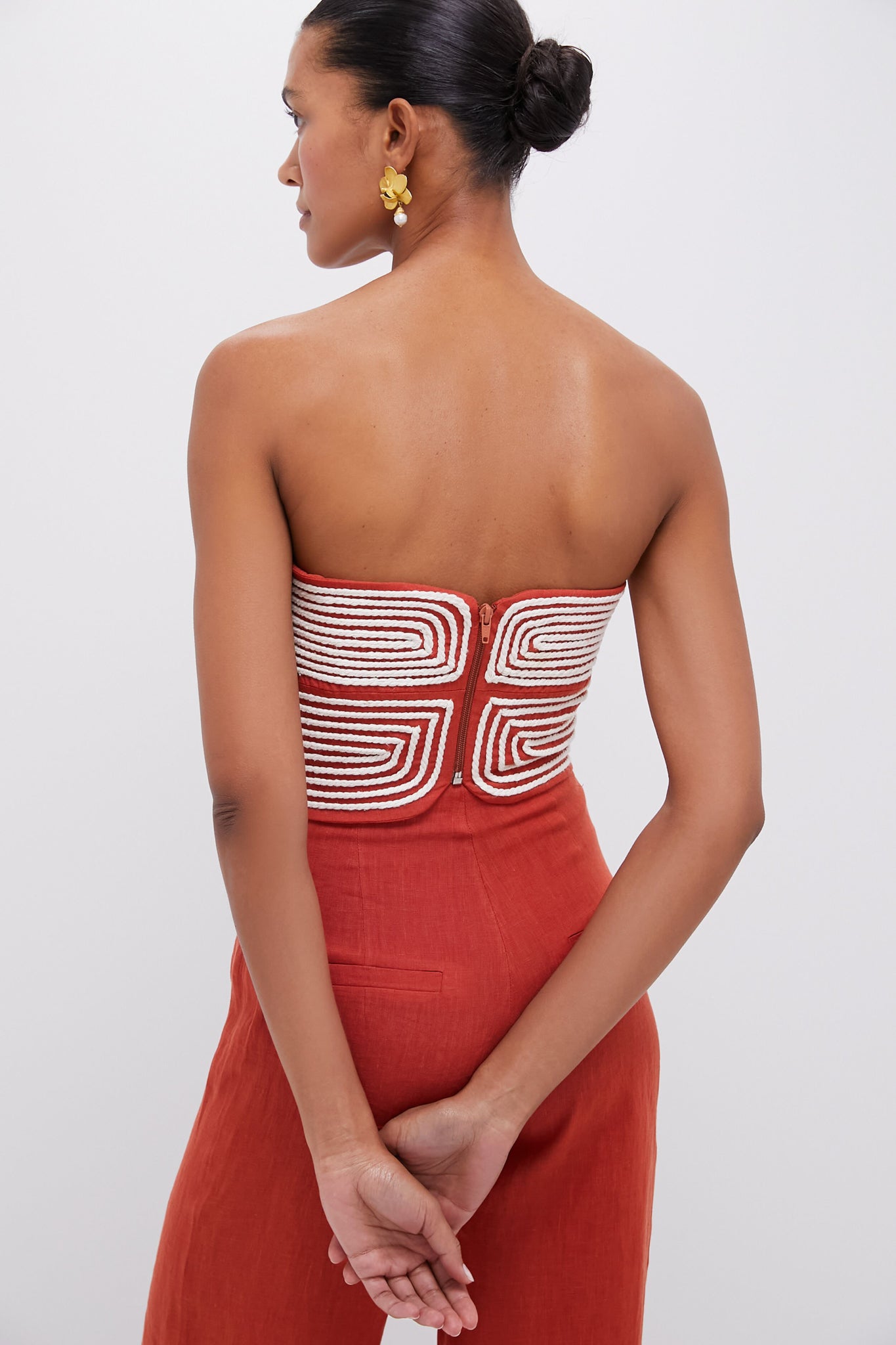 The Terracotta Baia Top stands out with a stunning embroidered bodice. that adds a fresh. artisanal touch to your wardrobe. With a fitted. strapless bodice and cut outs at the center. this top is sure to be a showstopper. We recommend pairing with the matching Terracotta Poesia Pants. heels or sandals. a mini bag. and a tan!