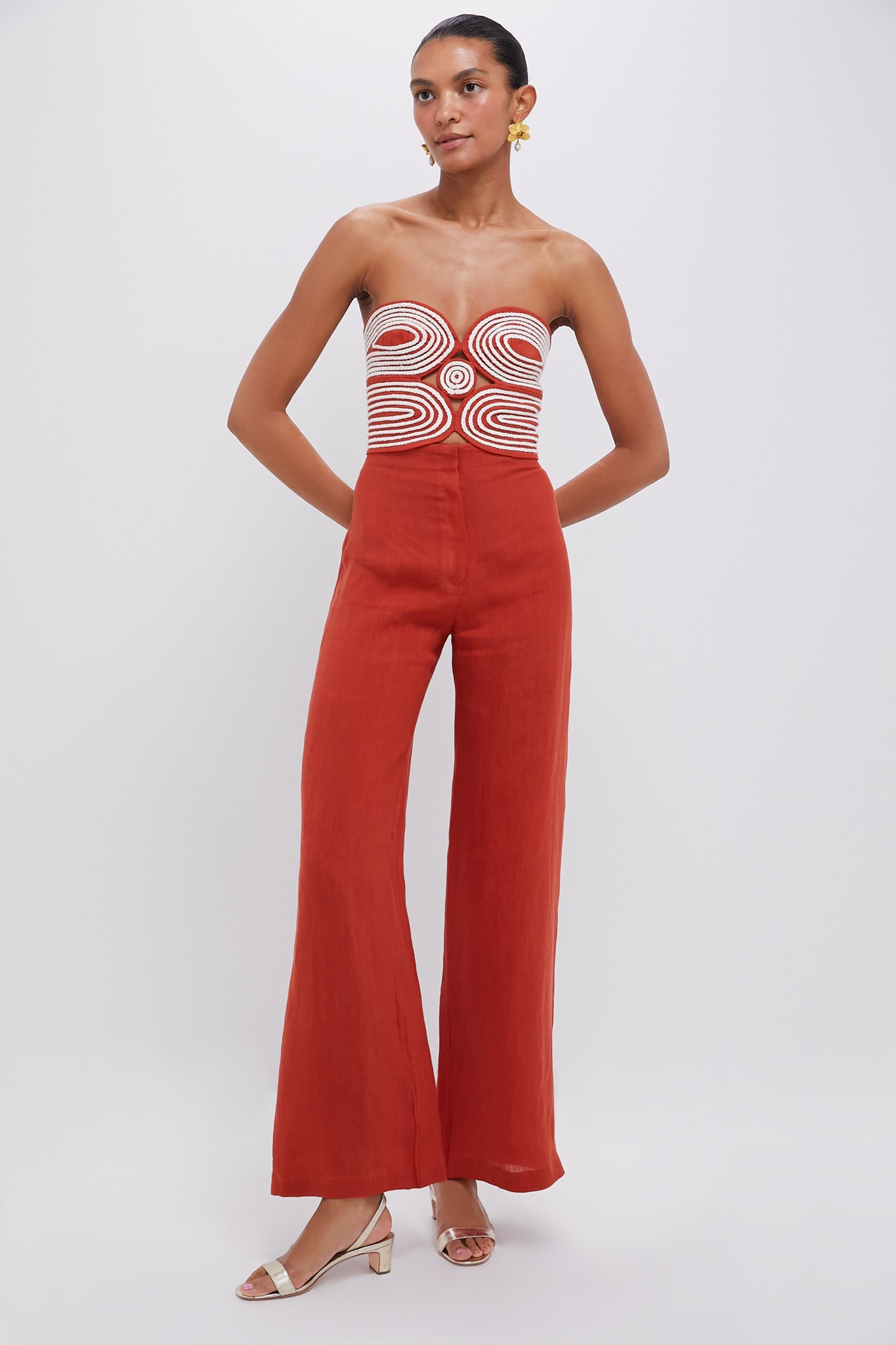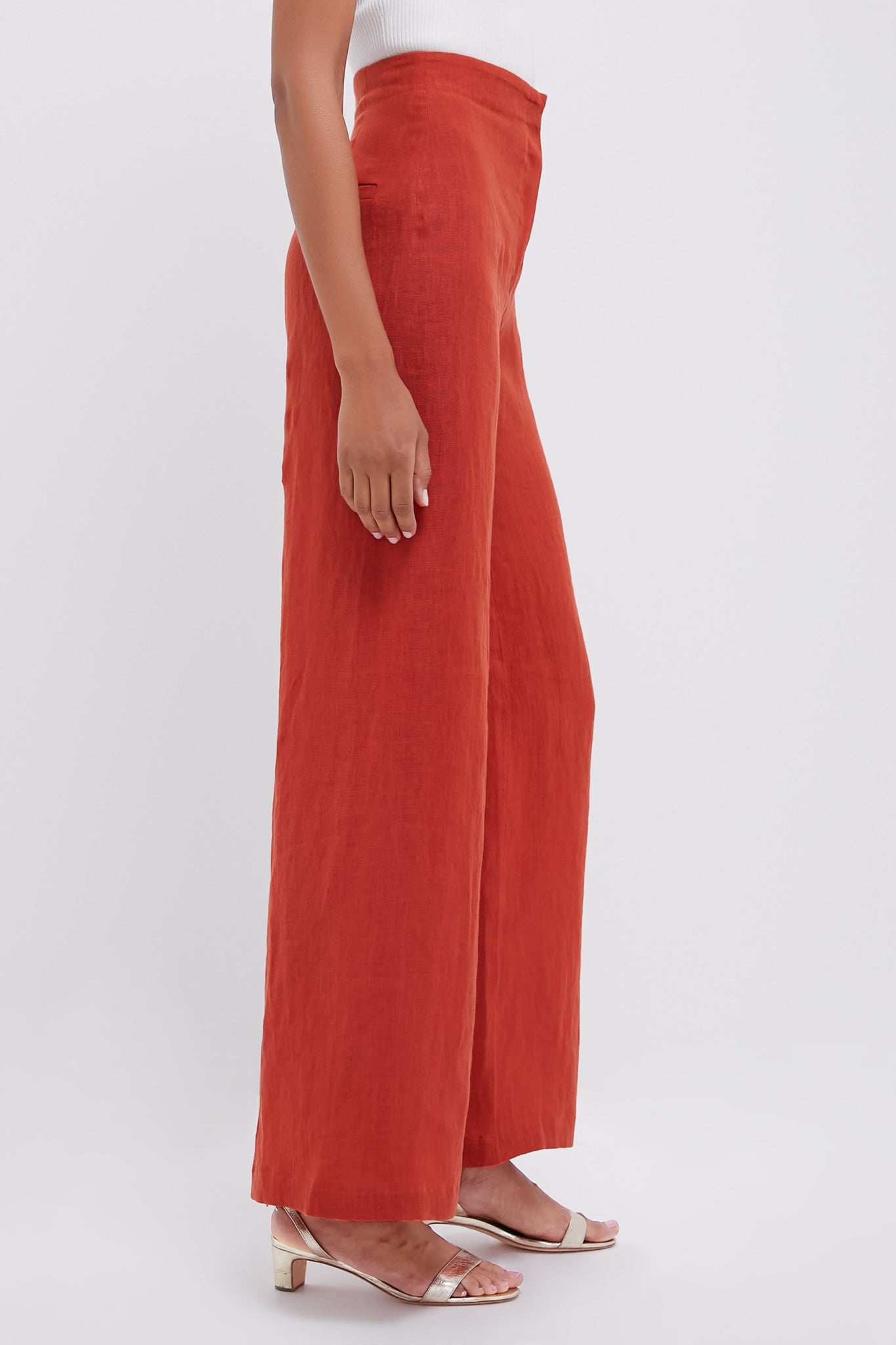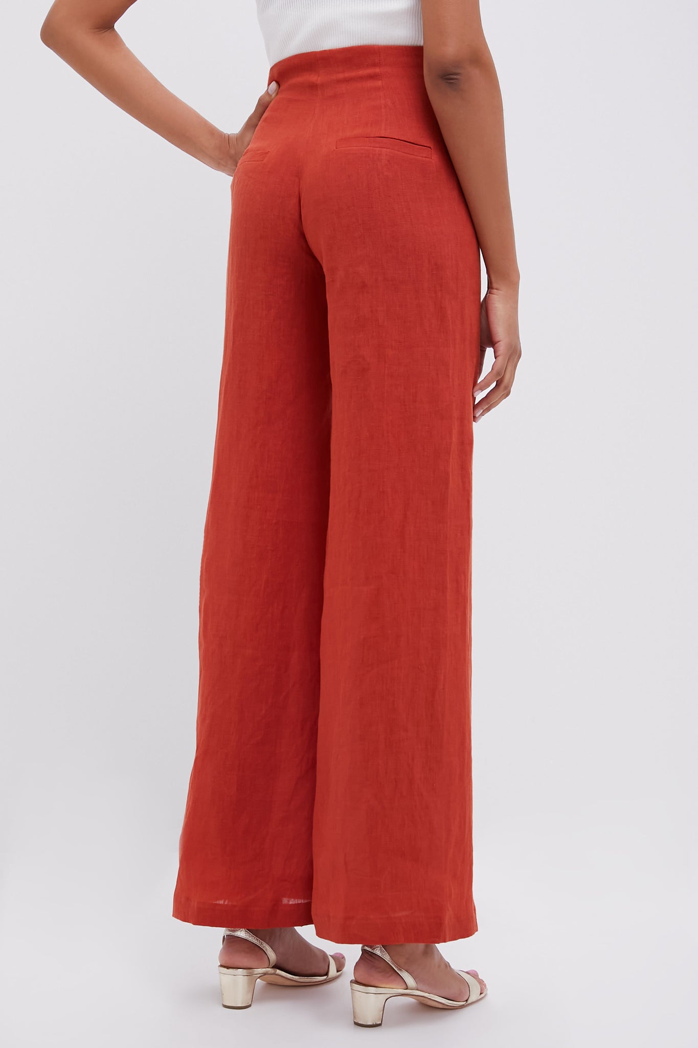 The Terracotta Poesia Pants feature a high rise and flattering wide leg silhouette. The perfect linen vacation pant. we recommend styling with the coordinating Terracotta Baia Top. heels or sandals. a mini bag. and a tan!