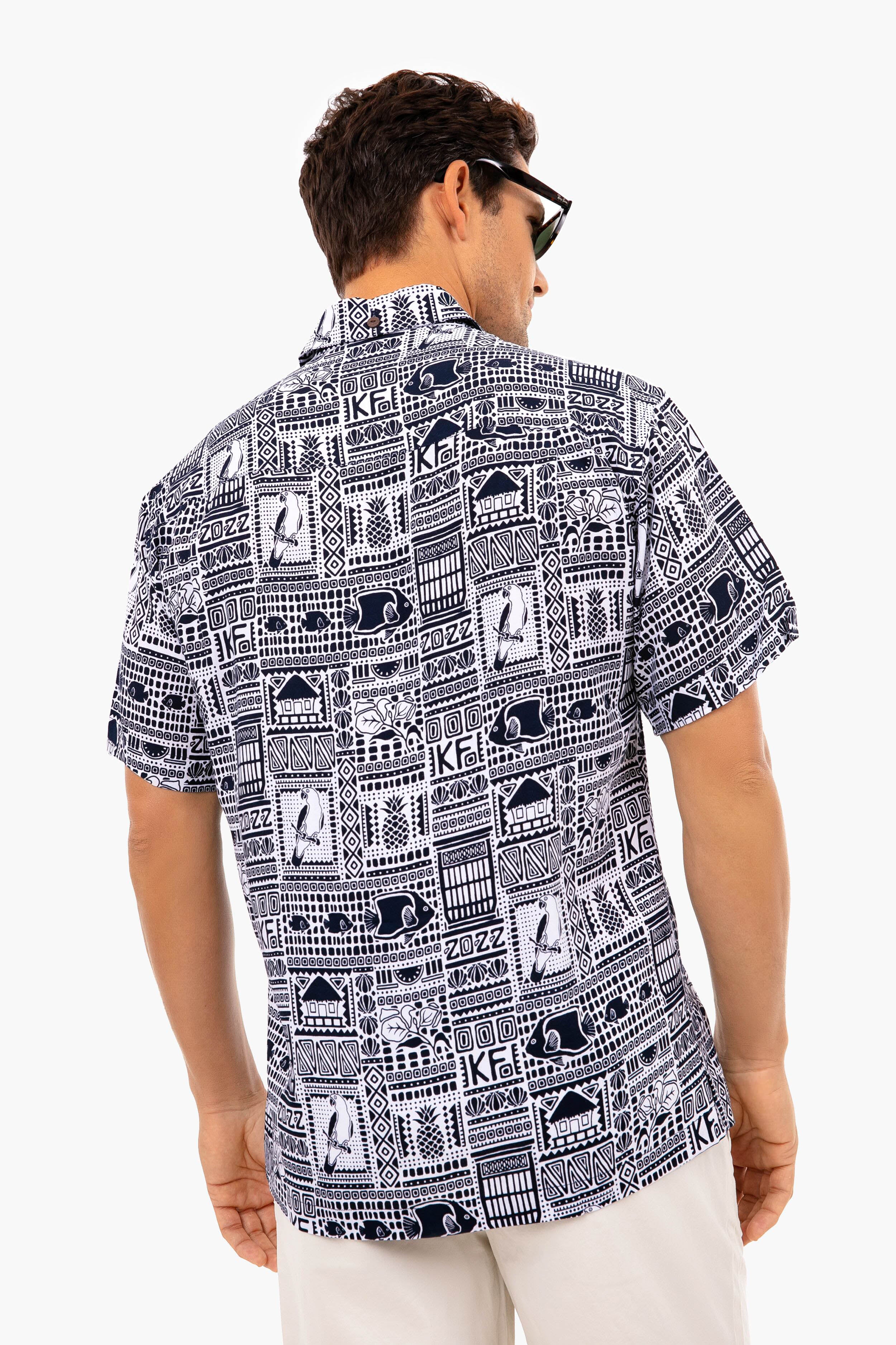 In a limited edition pattern for 2022. the Anytimer is a fun short sleeve button-down perfect for a barbecue with friends or a beach day. Made in Bali. this shirt features coconut buttons and a handprinted navy design in a soft and flowy material. Pair with shorts and sunglasses for a cool look.