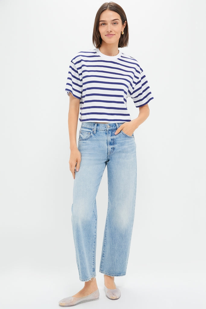 A boxy. slightly cropped tee with a classic crewneck and short sleeves the Thin Navy Stripe Cuff Tee is a closet staple. With a relaxed shape. this super soft tee pairs perfectly with jeans. flats. and a tote!