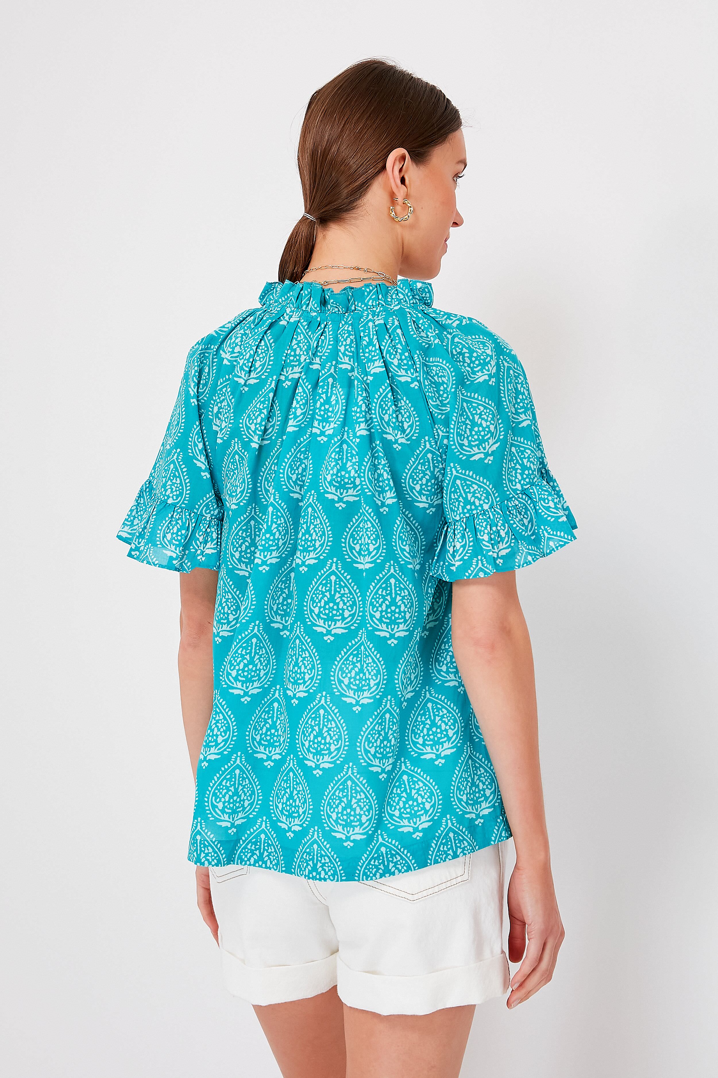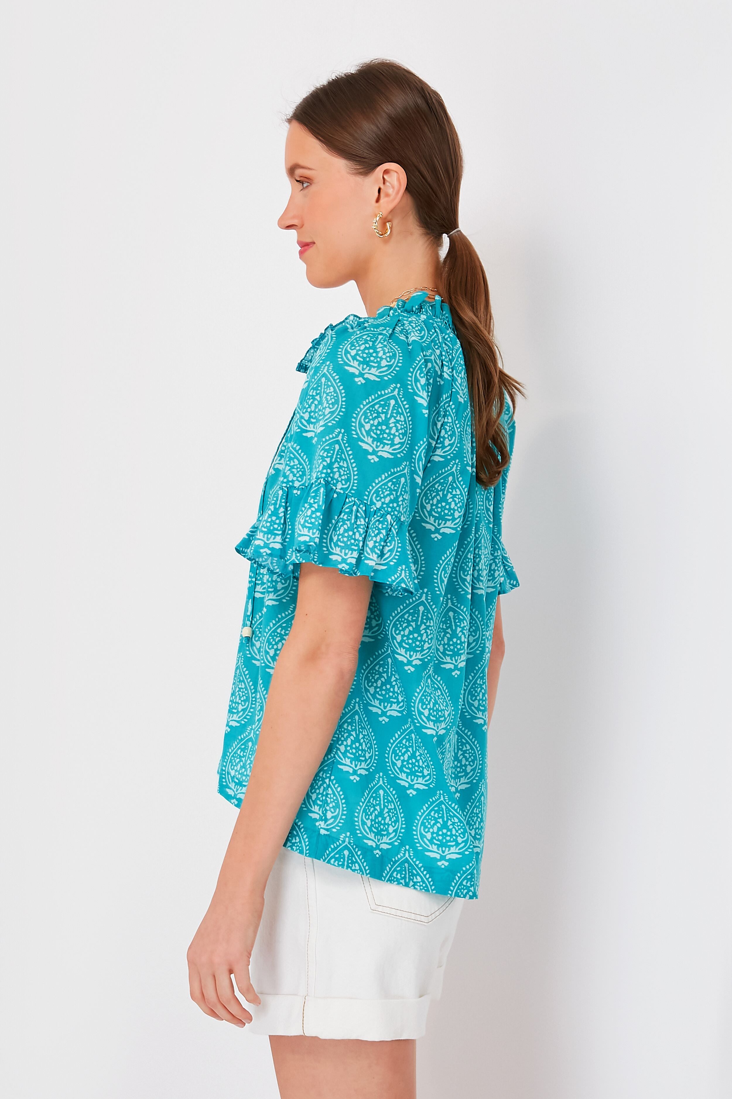 A great complement to cutoff denim. the Tropical Teal Lantern Block Print Cassis Top reminds us of the bright blue sea. soft sunsets. and warm breezes. With its easy shape. ruffling along the collar and sleeves. and tassel details. this blouse is the right blend of beautiful and breathable. Wear it over your suit as you head to the beach and throw on your go-to denim for easy day to night transitions.