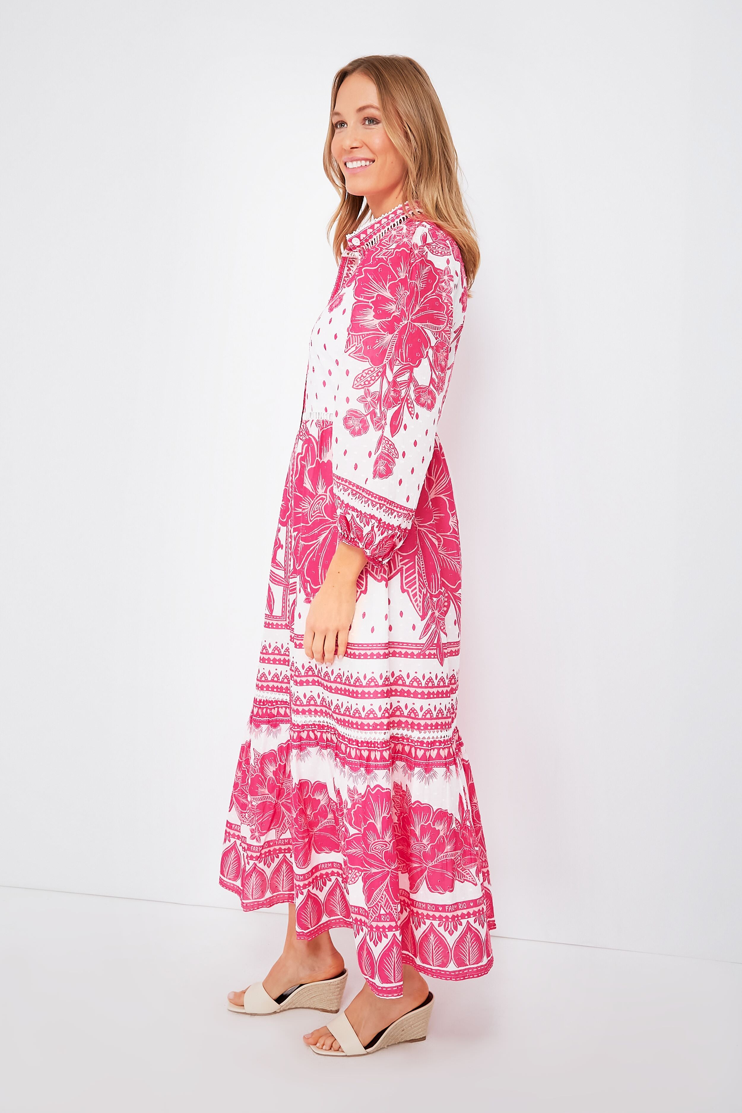 The Woodcut Eng Dress is here to make your day even brighter. from farmers' market runs to date nights and everything else in between. In a pink tropical print that's equal parts romantic and playful. this maxi features a full length button front that can be left undone for versatile styling options. long sleeves. and a flowy skirt that is just begging to be twirled. So what are you waiting for? Add a pair of wedges and dainty accessories to let the dress shine!
