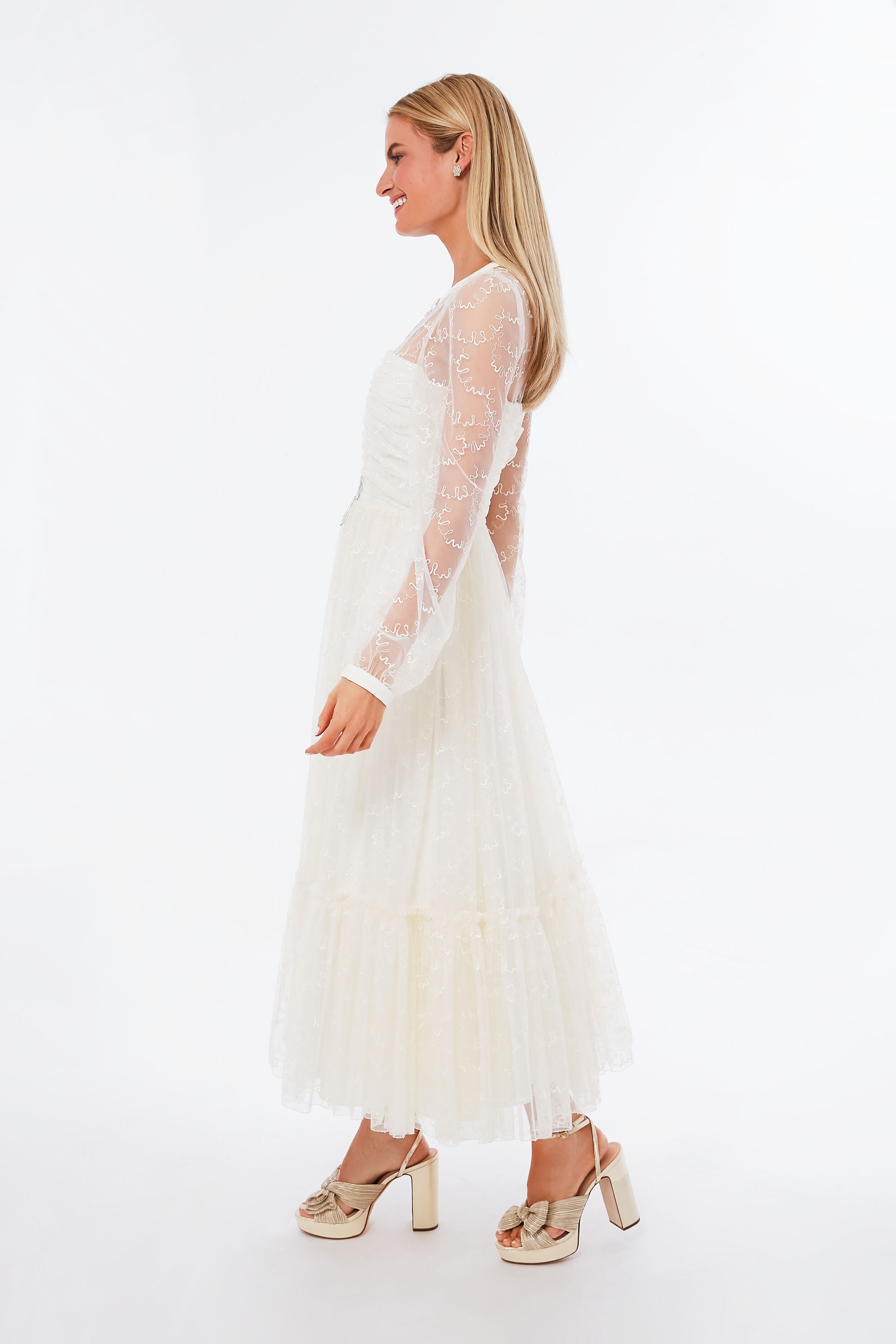 Perfect for event dressing. the Tusk Camille Dress is elegant and fun in equal measure. Cut from fluffy and soft tulle. this midi features curly embroidery details everywhere. a flattering ruched bodice. and a split down the front connected by glimmering beaded bows. The ultimate style for holiday parties. seasonal celebrations. and shimmery soirees. we love how fresh this silhouette looks when styled with heels and a clutch. Grab a glass of bubbly and you're sure to have an evening to remember.