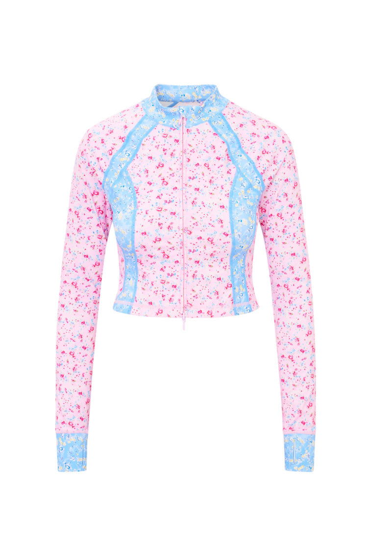 For the girls on-the-go. our Veda Jacket arrives. This athleisure layer elevates your look and is the perfect essential for a cool weather workout or running errands around town. Featuring a ditsy floral print mix paneling and breathable fabric. she's the jacket that goes with us everywhere.