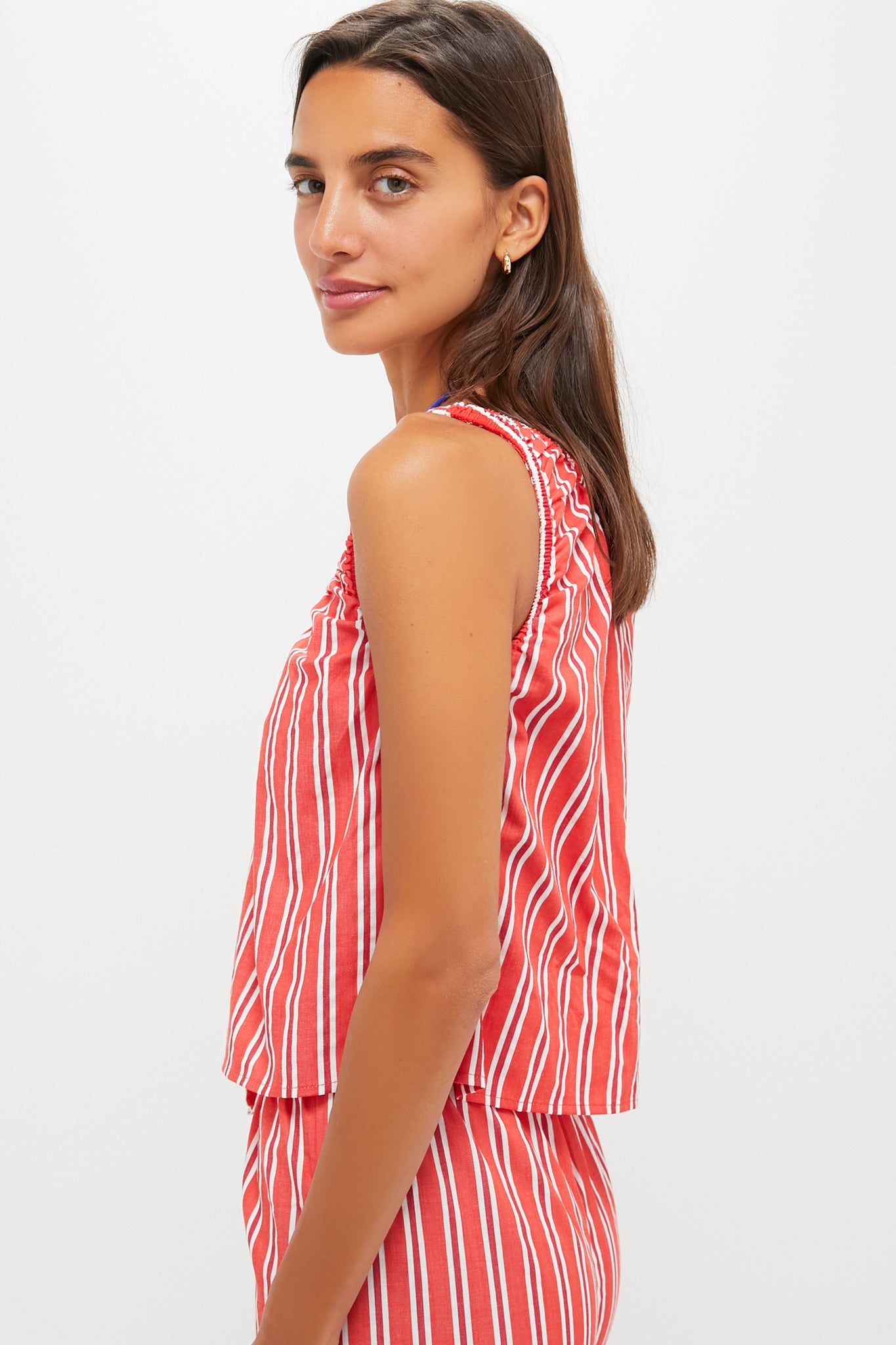 This Vibrant Red Stripe Scoop Neck Cami is playful. punchy. and ready for anything. The breezy scoop neck and contrasting vertical stripes flatter every frame. especially when paired with the matching Vibrant Red Stripe Waist Pant for an effortlessly cool set.