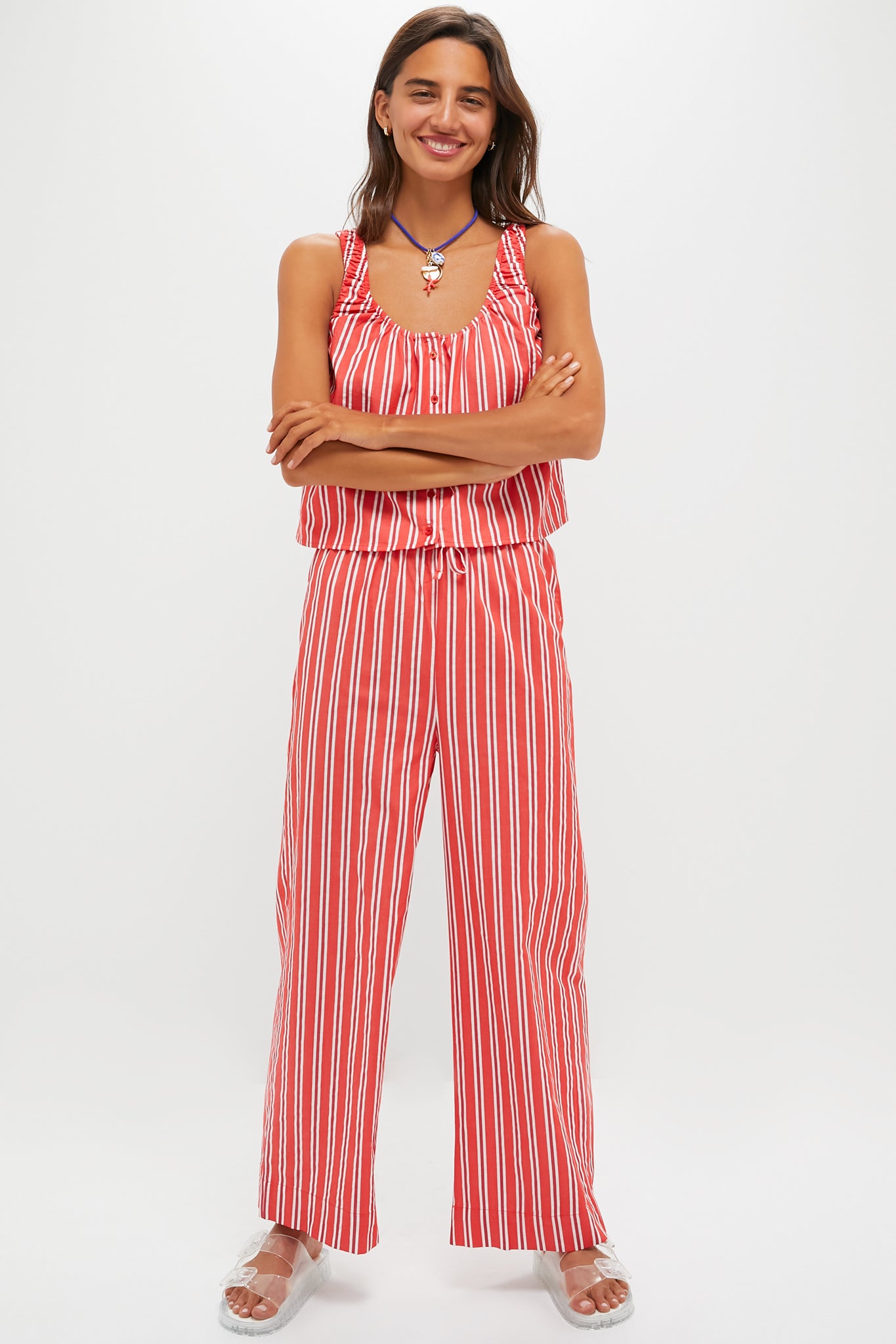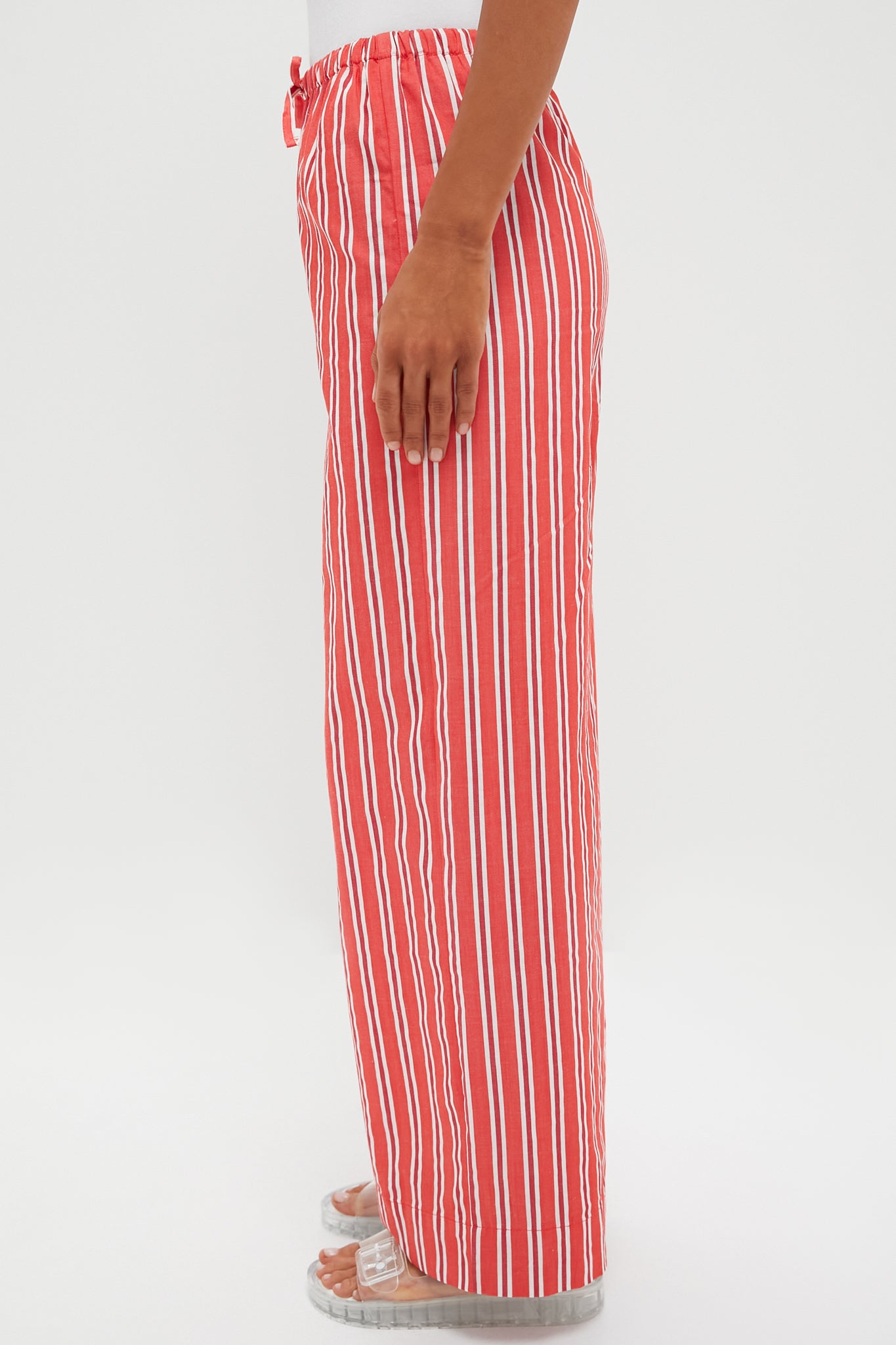 This Vibrant Red Stripe Waist Pant is playful. punchy. and ready for anything. The comforting elastic waistband and contrasting vertical stripes flatter every frame. especially when paired with the matching Vibrant Red Stripe Scoop Neck Cami for an effortlessly cool set.