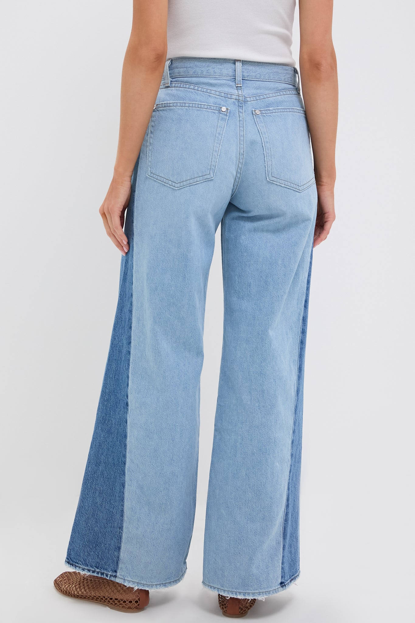 The Vintage Wash Two Tone Ramblin Man Jeans are a mid-rise. wide leg jean in two tone denim. With a relaxed hip and a five-pocket style detailed with nail head rivet hardware. we recommend pairing with tees. tanks. or buttons downs. flats or sandals. and your favorite bag!