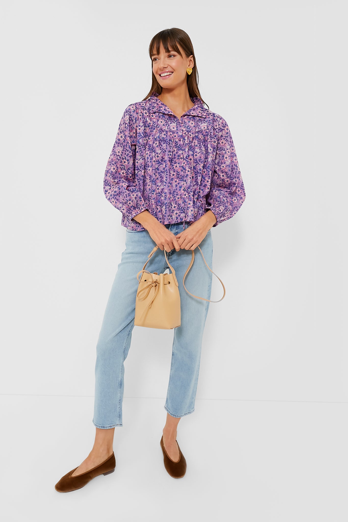 The Violet Wildflower Organic Emmaline Blouse is made from printed cotton with cheerful purple wildflowers. This style features a button front. ruffle collar. shirred body. and blouson sleeves with elastic cuffs. Perfect for weekend strolls through the farmers' market and brunch with friends. we are pairing this with denim and leather accessories for a boho-chic look.