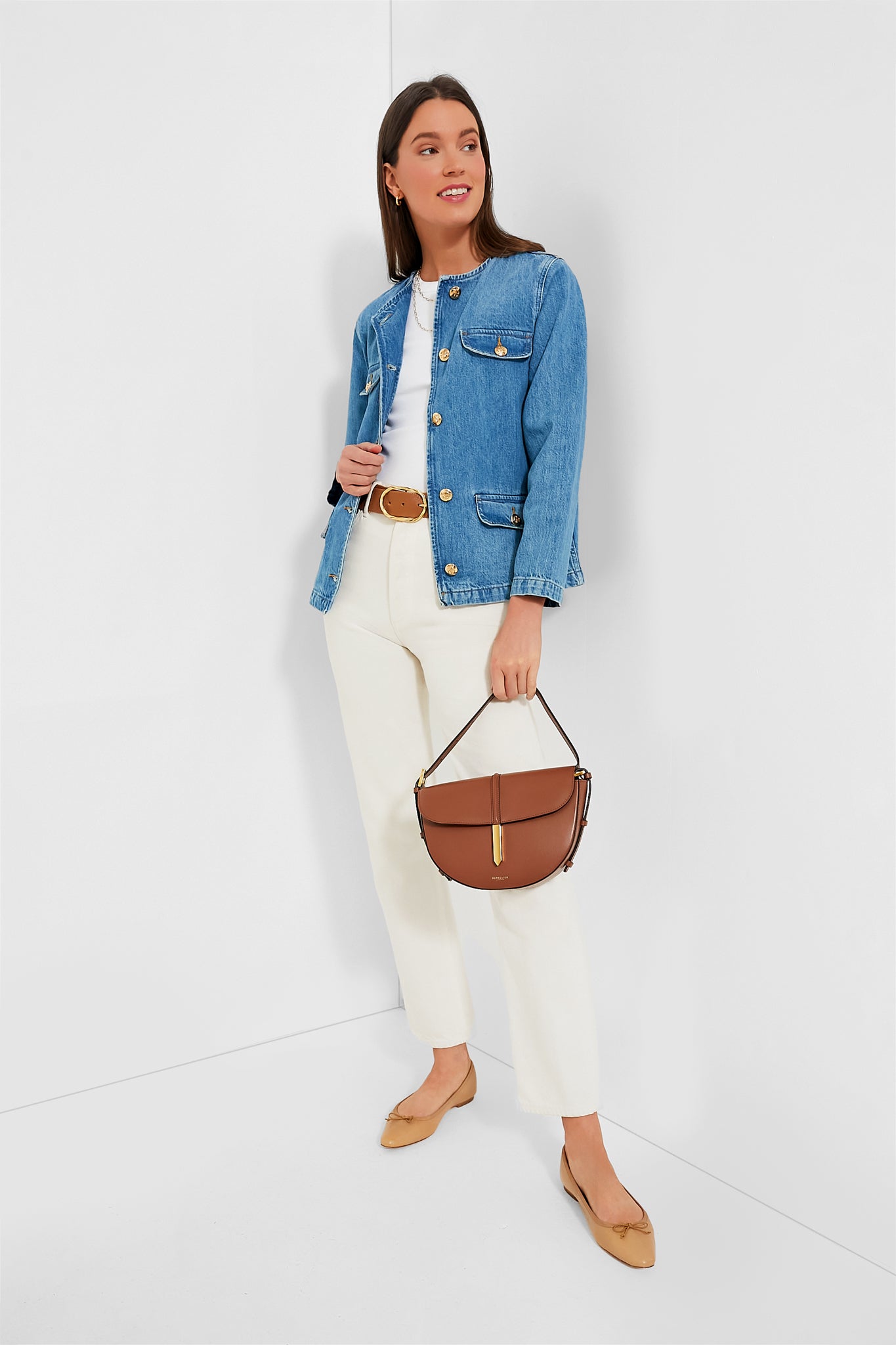 A modern take on a vintage-inspired silhouette. The Janet Jacket is crafted from a midweight. rigid organic cotton denim blend in a medium blue wash. Its timeless construction features a crew neckline. bracelet-length sleeves. gold tack buttons. and four flap pockets. Pair with denim for a chic Canadian tuxedo. or with a mini dress and sandals.