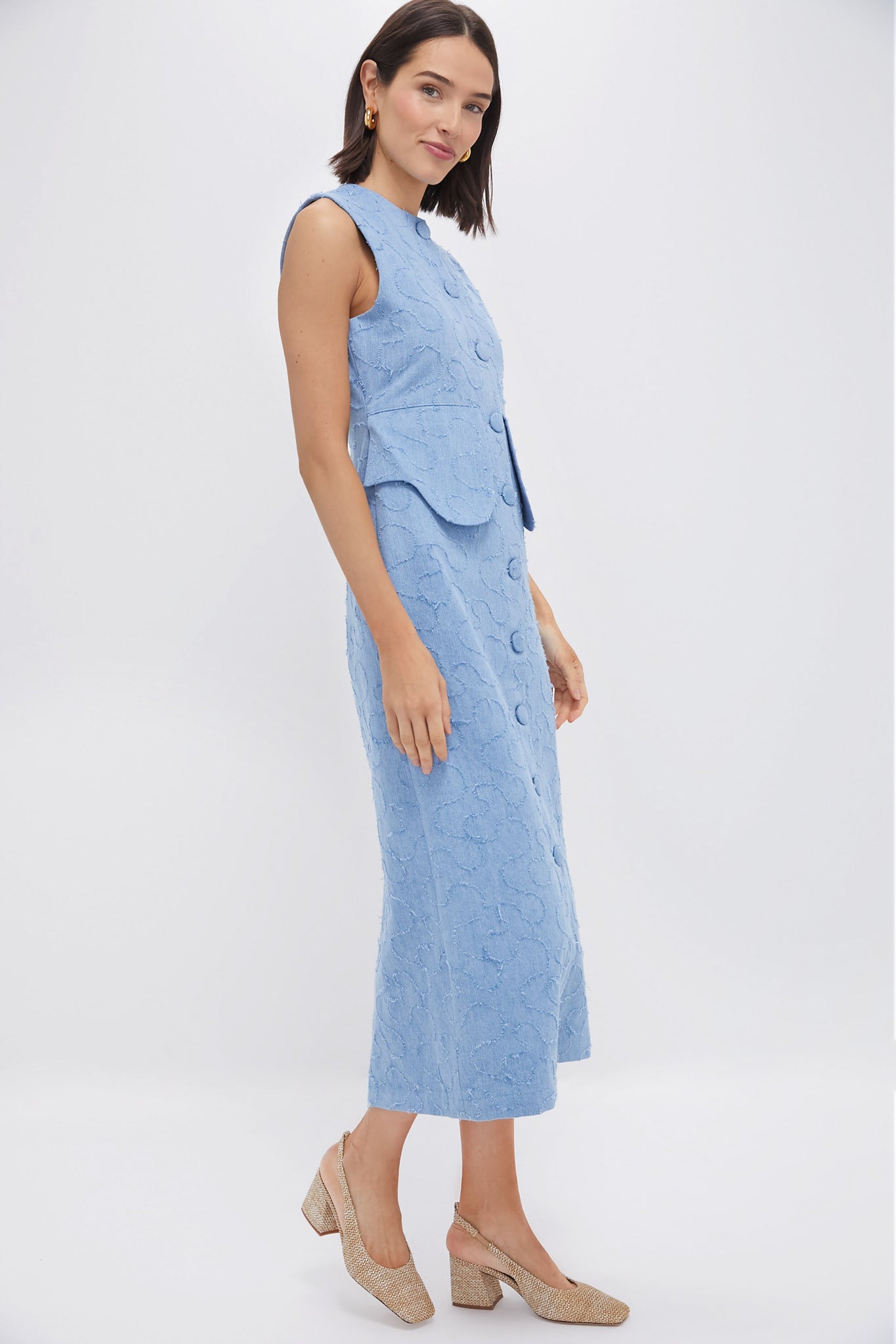 Featuring oversized buttons. textured fabric. and a unique waist detail. this sleek sleeveless midi is ladylike yet fun. Pair with heels for the office and add a raffia tote for events.
