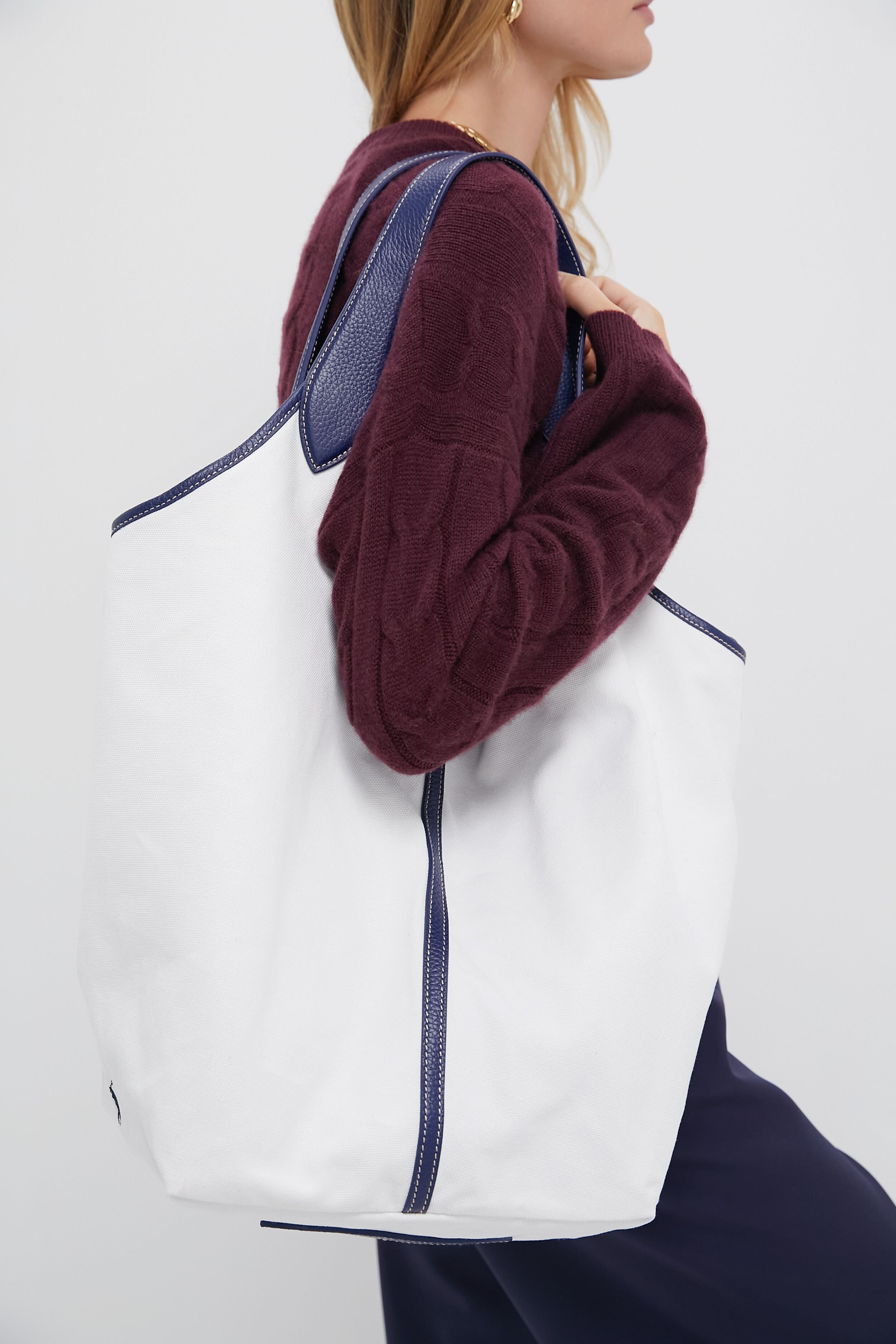 The White and Ink Polo Large Canvas Tote provides all the space you need for everyday ease. With a snap leather closure to ensure your essentials are safely kept. leather straps. and square envelope folded base. this tote is not only functional. but chic! Take this with you from day to night. styled with anything from cardigans to maxis.