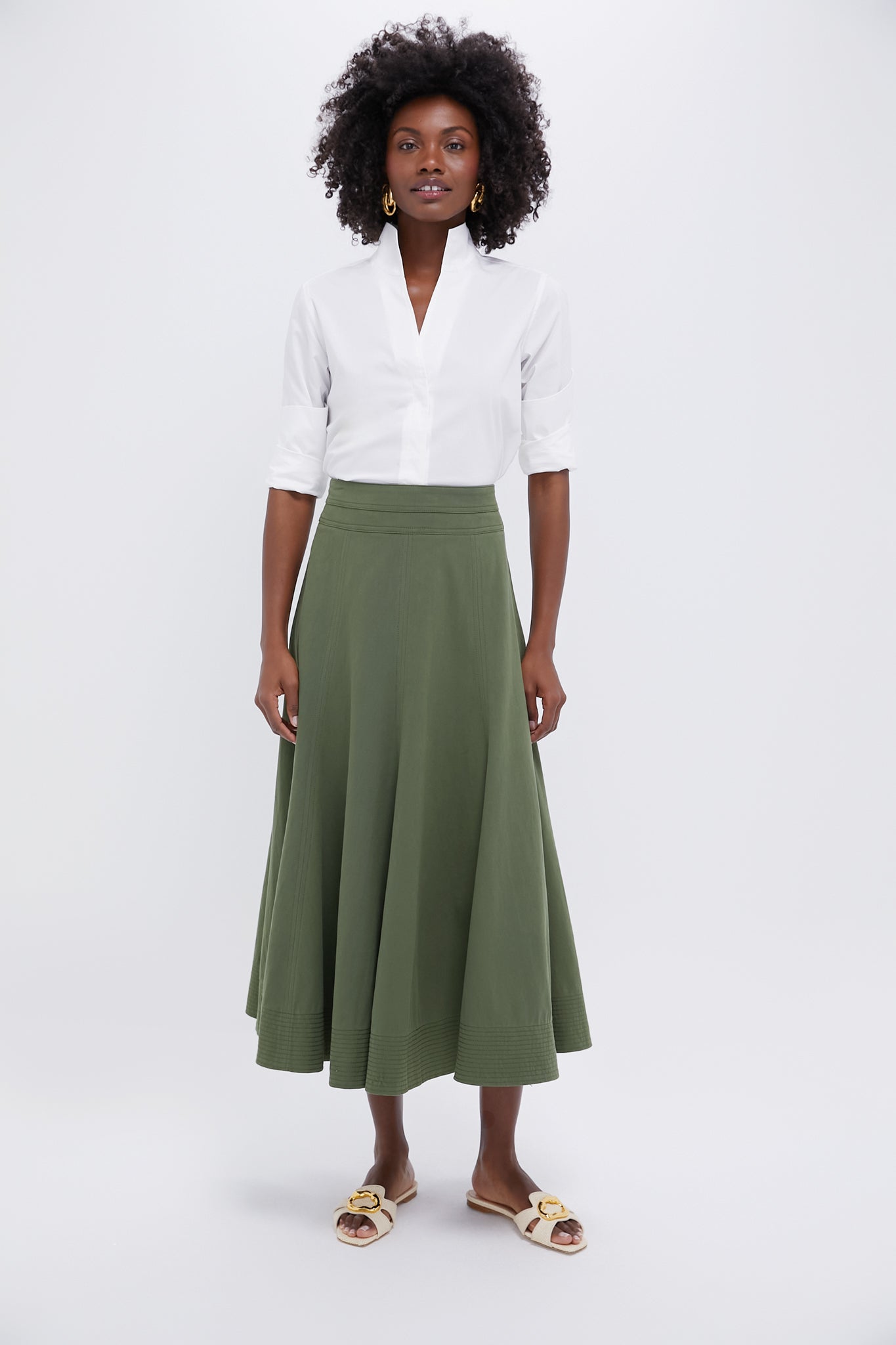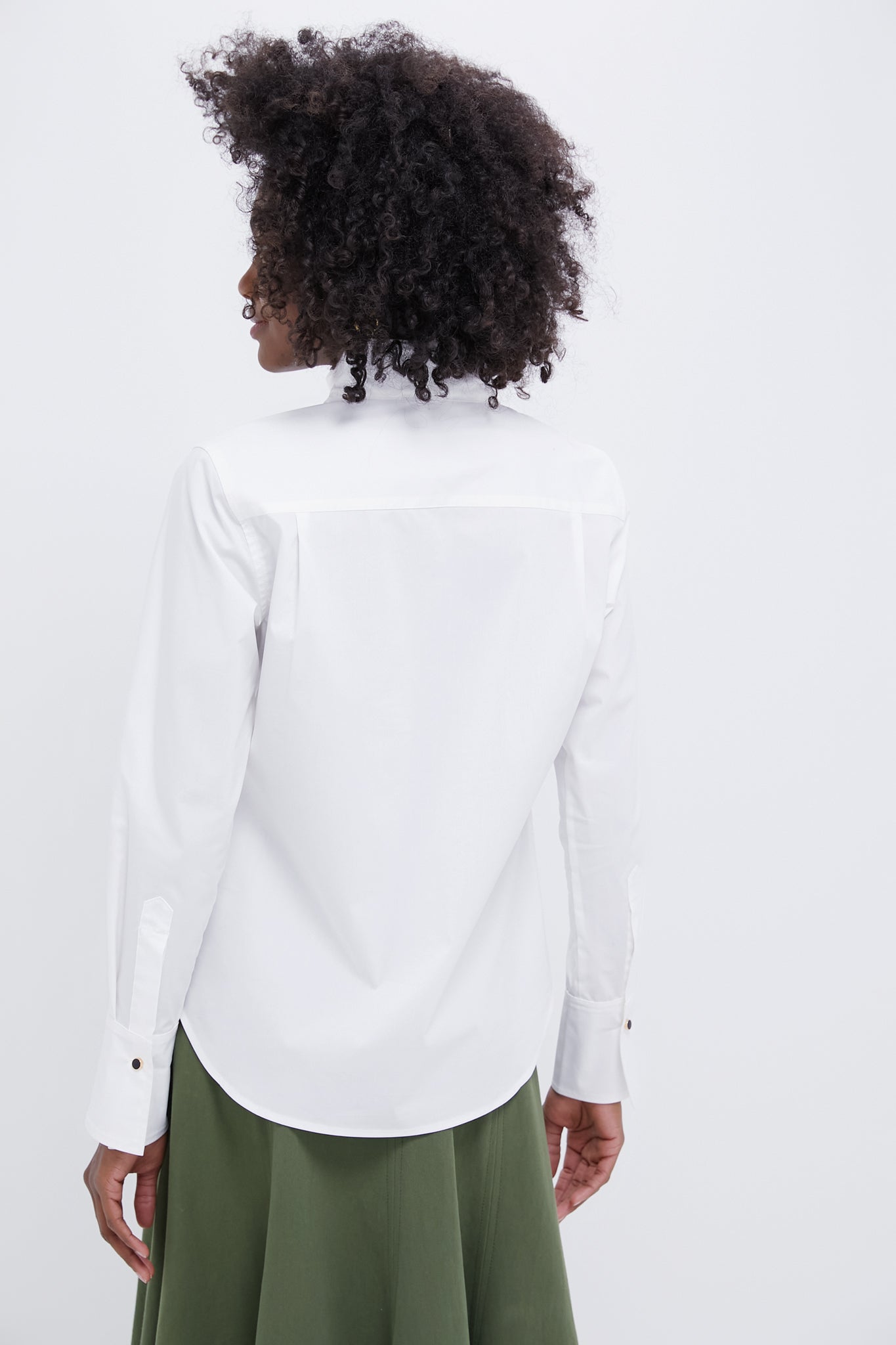 Inspired by Carolyn Bessette-Kennedy. the White Bessette Button Down is the chicest everyday blouse. Fitted to enhance femininity. it boasts a stand collar and hidden button placket. The shirt that can do it all - style it with shorts. chinos. denim. a skirt. you name it.