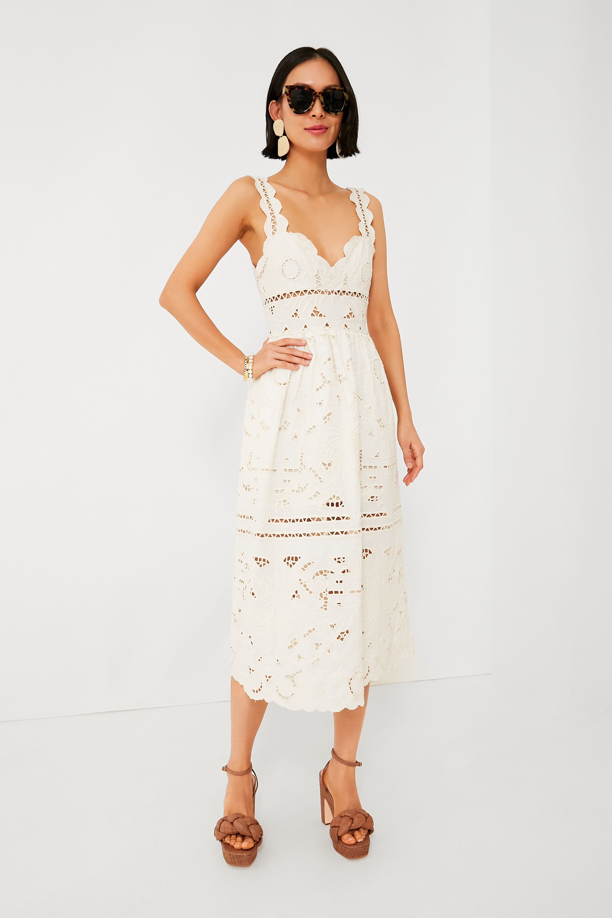 Full of summer appeal and understated glamor. the White Blaire Dress is quickly becoming a favorite of ours. Featuring a flattering yet fitted waistline. a romantic full skirt. and scalloped detailing throughout. this beauty has us feeling like we are up in the clouds. Our favorite details have to be the graceful white hue and charming. see-through eyelet detailing. perfect for an outdoor wedding or garden tour. Style with lace-up flat sandals. gold jewelry. and a metallic shoulder bag for a breathtaking look.