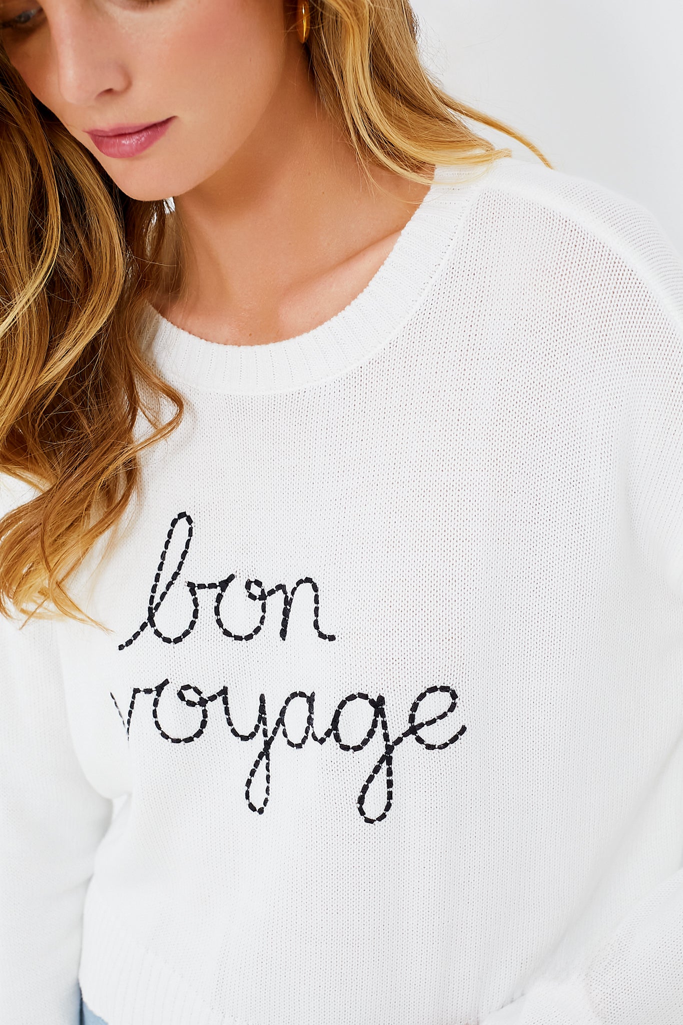 Dreaming of travel? You will love the irresistibly soft White Sienna Sweater. This relaxed silhouette features a crew neckline. ribbed hem. and embroidered "Bon Voyage" slogan on the front. An easy style to wear year-round. we are pairing this with leather pants and boots for the winter and denims shorts and ballet flats for the summer!