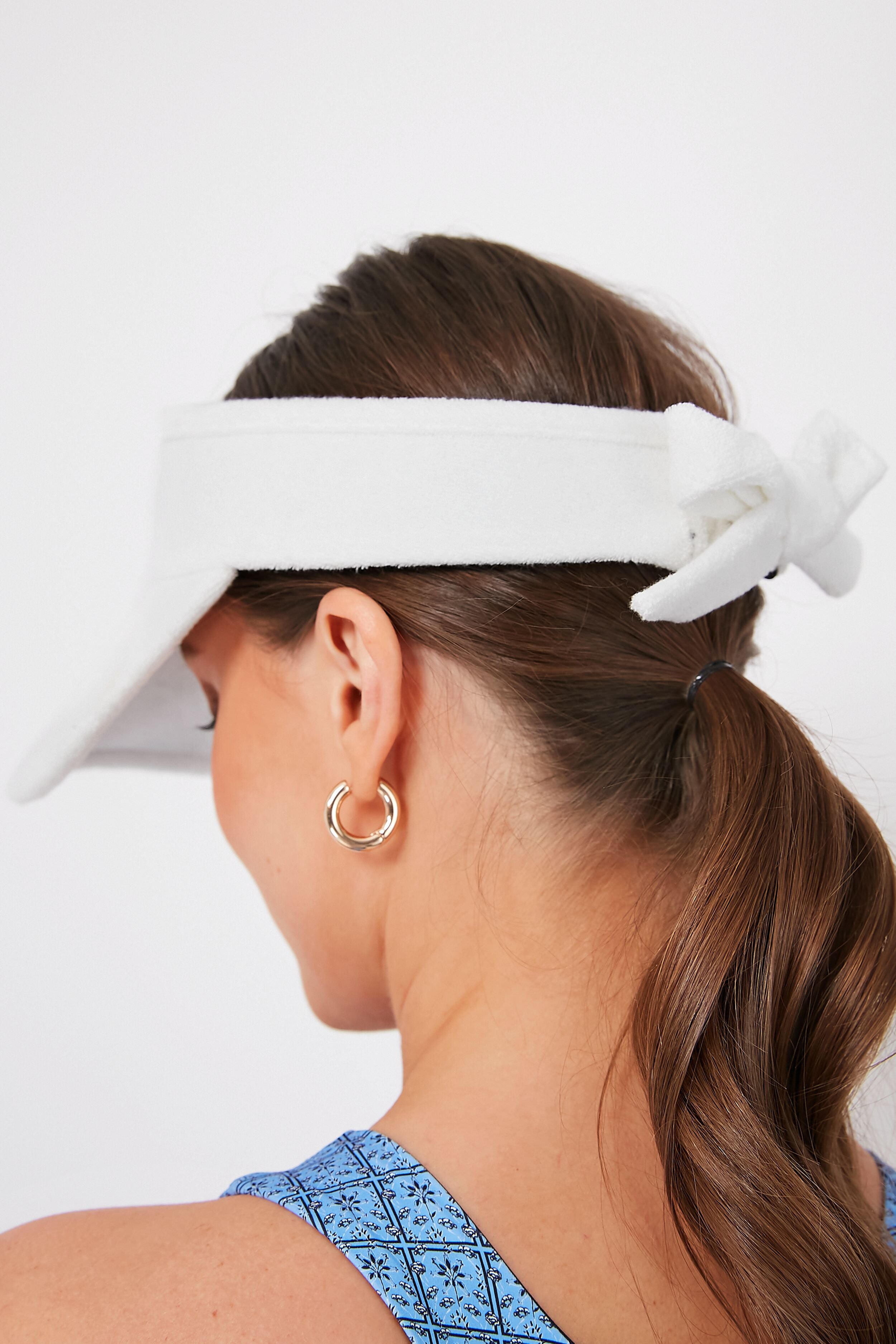 Combining sporty and chic. the Bow Tie Visor is a necessity for fun in the sun this season. In a bright neutral hue that pairs well with your tennis whites. a golf skirt. or even joggers. this accessory is going to be on repeat whether you're dealing with a bad hair day or not! Add it to your outfit for coffee runs. hitting the courts. and hot girl walks alike.