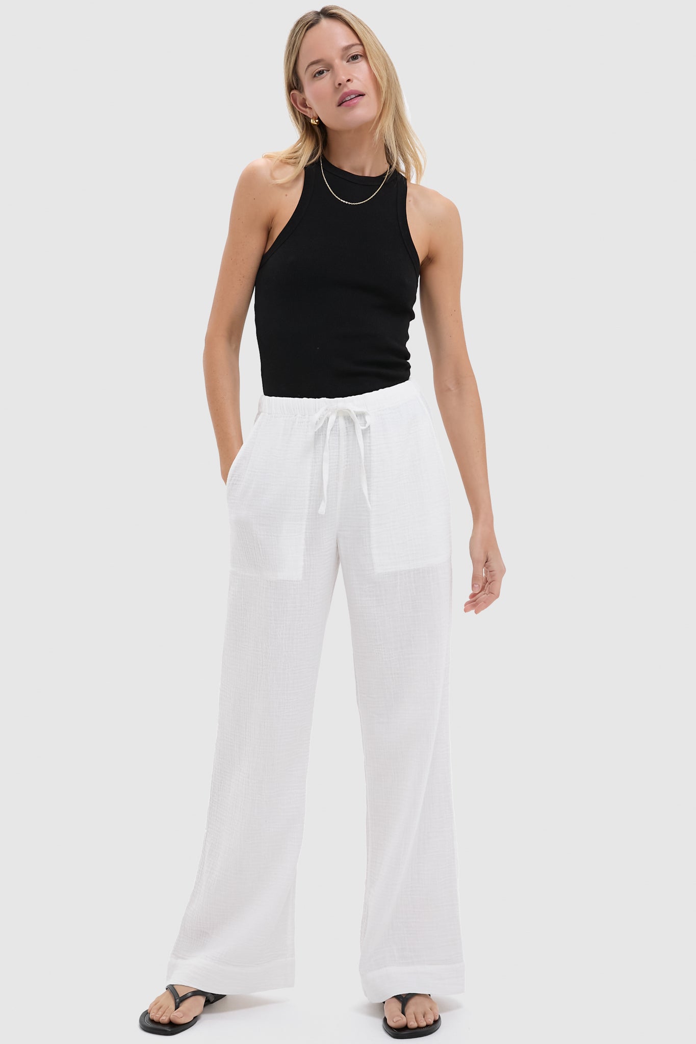 Perfect for slow mornings and breezy walks at sunset. these softer-than-soft double gauze cotton pants are exactly what you'll want to wear with your favorite tees or button-downs. The subtly textured fabric feels airy and comfortable. while the encased elastic waistband with an adjustable tie front ensures a perfect fit every time.