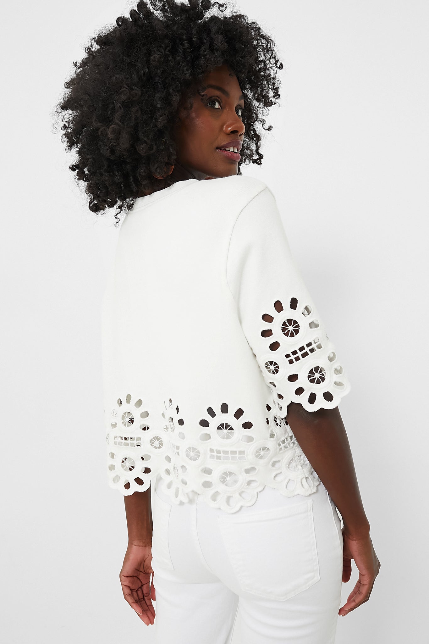 An easy silhouette with elevated details. the White Elysse Embroidery Short Sleeve Top is a perfect warm-weather staple. This shirt features oversized eyelet detailing on the sleeves and hem. and is designed for an easy. relaxed fit for a day of style and comfort. Pair with denim shorts and sneakers or dress up with a maxi skirt and sandals- this unique stunner can be styled hundreds of ways!