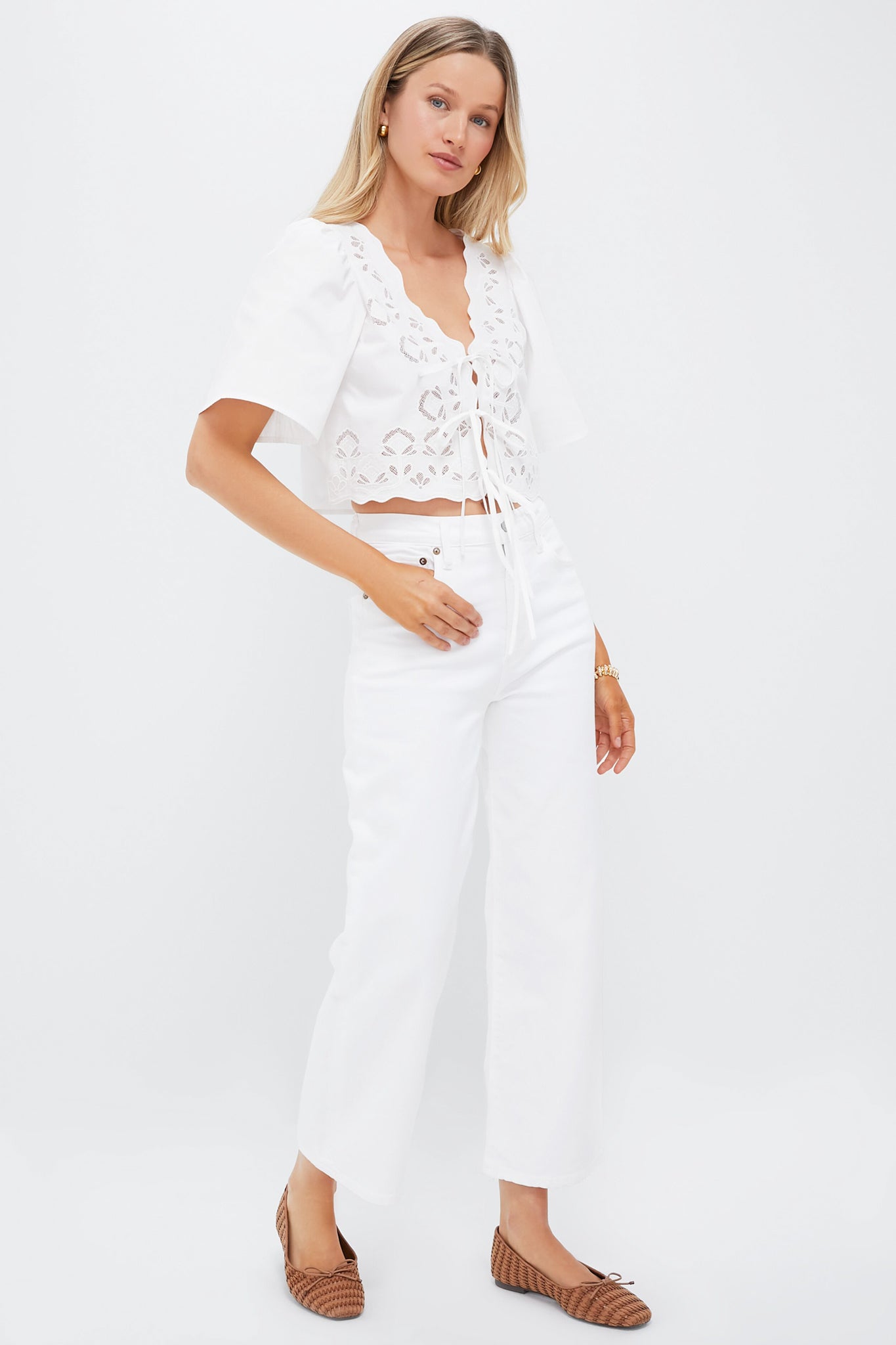 This chic style boasts a flattering cropped silhouette with front self-ties. scalloped trim. and eyelet detailing. Perfect for spring and summer dressing we are pairing this fun and feminine number with denim of all colors and sandals for a warm-weather look that checks all the boxes.