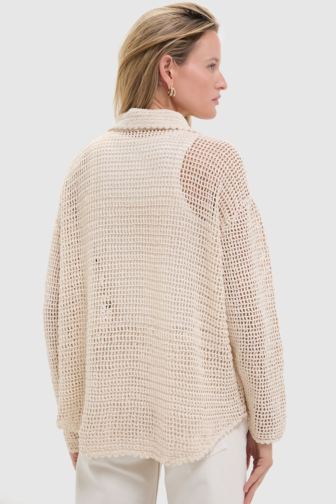 The White Rosa Emery Crochet Shirt is hand crocheted with a dagger collar and dramatically gathered sleeves. With symmetrical rose motifs that add a dash of color. this fun top is unlined and perfect for layering. We paired it with wide leg denim. a tank. and tote for a fun look!