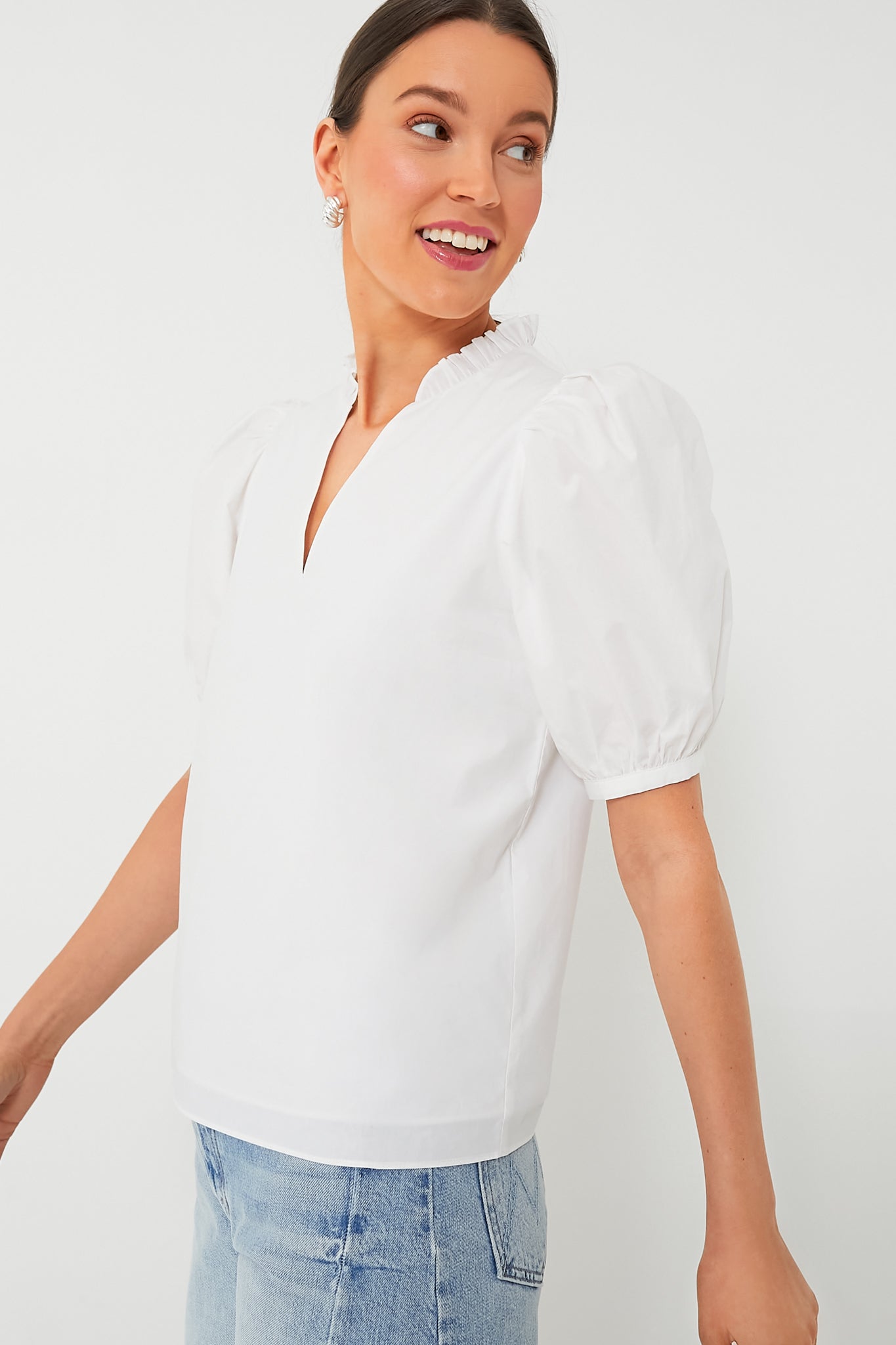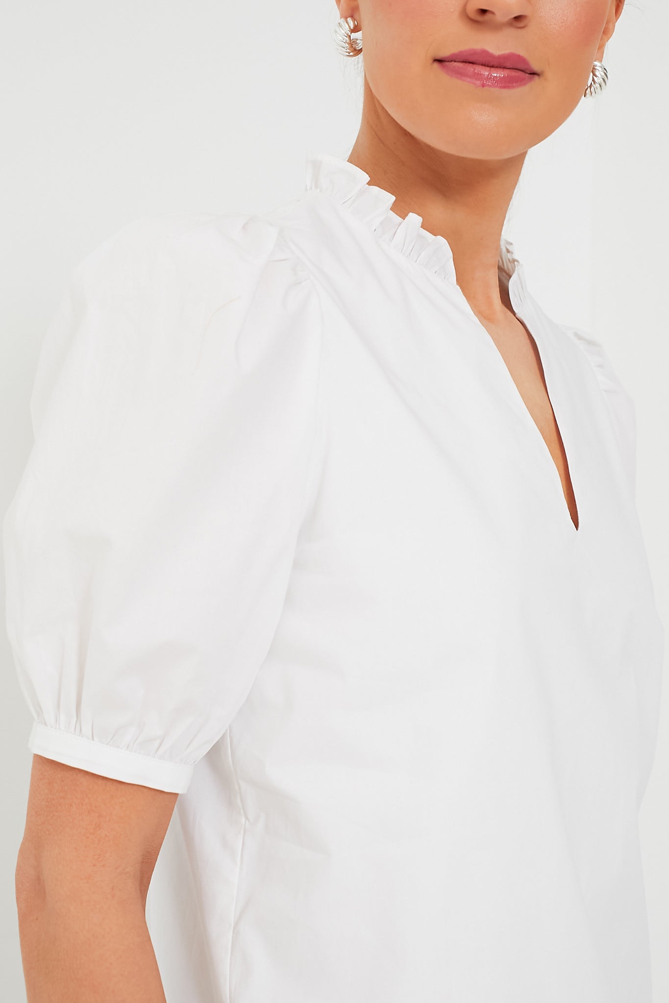 Versatile and chic. the Leigh Blouse is the perfect style staple for your closet! Featuring a v-neckline. ruffle detail at the neckline. and subtle puff sleeves. the ways to wear this crisp white top are endless. Pair with your favorite pair of jeans. gold accessories and neutral heels for happy hour. or wear with flat sandals and a tote bag for trips to the farmers market!