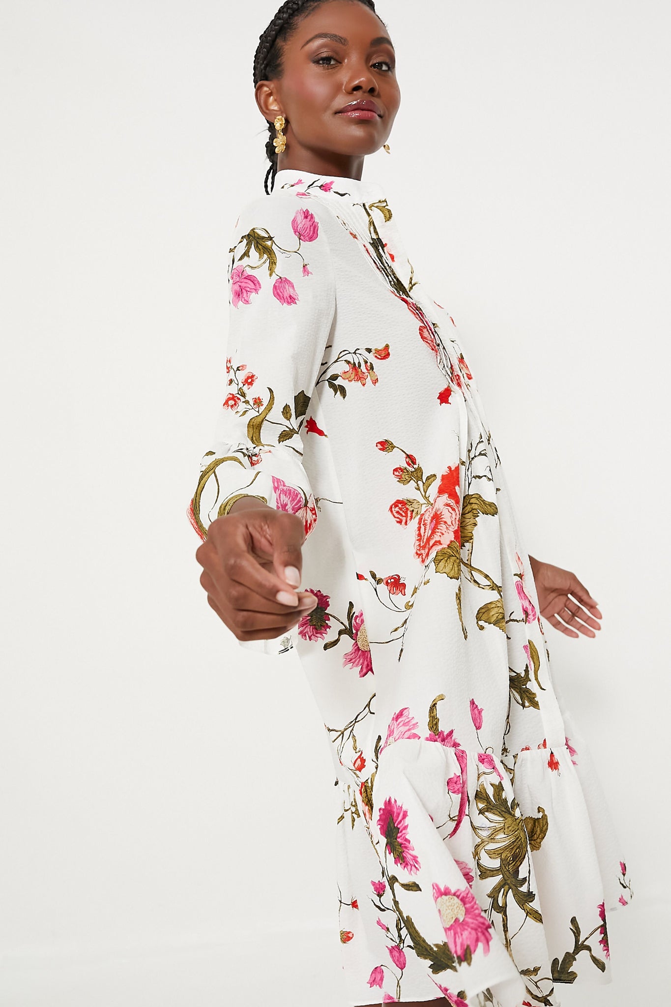 Made from summery cotton seersucker. the White Short Dress will make an easy-to-wear addition to your warm-weather rotation. Colorful florals stand out against a crisp white base. this relaxed mini is framed by a stand collar. flounce cuffs. and tiered hem. The pleated front panels add extra volume to this swishy style that we can't get enough. Add sandals and some statement jewelry for an effortlessly cool look perfect for anything from luncheons to cocktails.