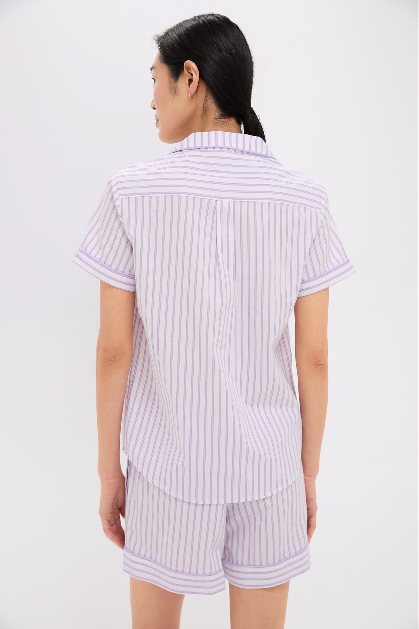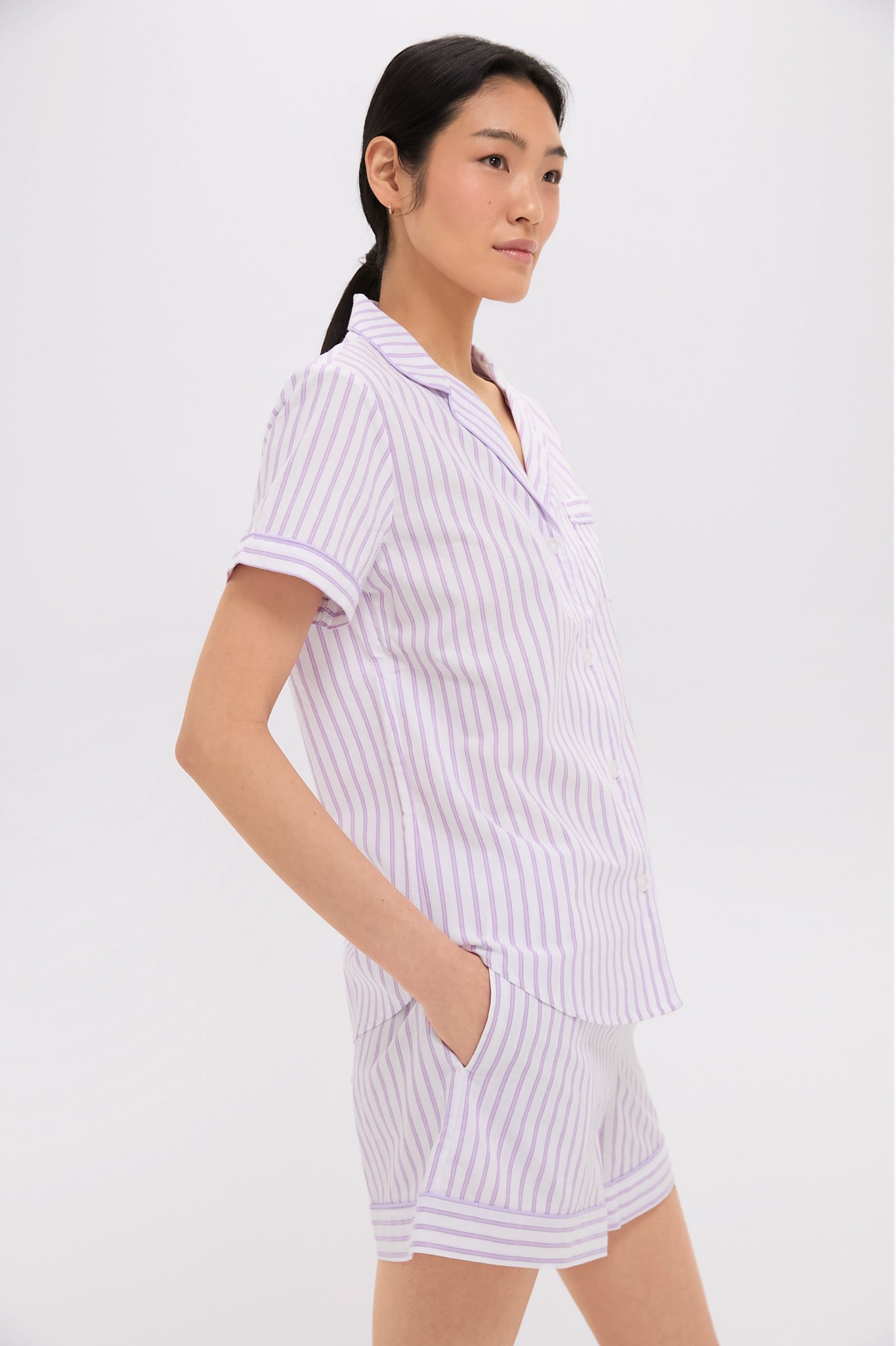 The Lavender French Ticking Short Set are adorable and oh-so-classic. These short sleeve sleeve pajamas feature a notch collar. front chest pocket. and a soothing lavender stripe pattern. The drawstring shorts allow for perfect fit. and the incredibly soft cotton will make these a sleepwear favorite.