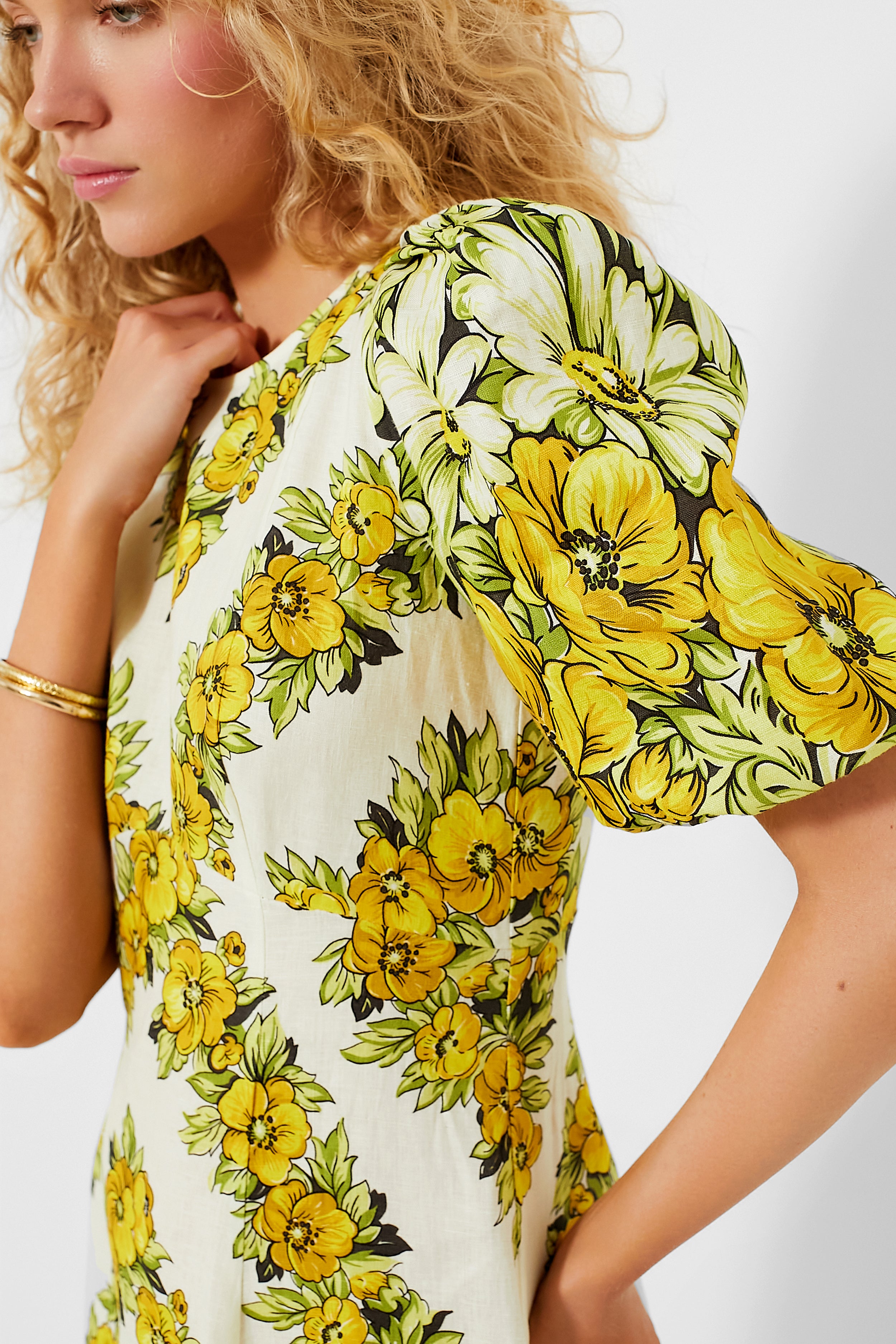 The Yellow Gisela Dress was made for your warm-weather wardrobe. This enchanting midi features short puff sleeves with elastic cuffs. an A-line paneled skirt. and a classy yellow and green floral pattern. Pair with heels for dinner parties. or with sandals for summer brunches.